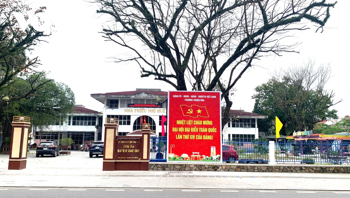 Tại Nhà Thiếu nhi thành phố Huế, không gian được trang hoàng rực rỡ, trang nghiêm, hướng tới Đại hội đại biểu toàn quốc lần thứ XIV của Đảng.