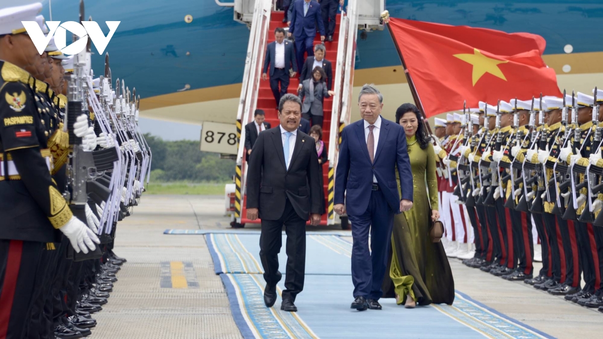 Tại sân bay quân sự Halim Pedranakusuma với sự coi trọng cao độ, trọng thị, cởi mở và thắm tình hữu nghị, Indonesia đã bắn 7 loạt đại bác chào mừng đoàn đại biểu cấp cao nước ta. Đón Tổng Bí thư Tô Lâm và Phu nhân có Bộ trưởng Bộ Hàng hải và Thuỷ sản Indonesia Sakti Wahyu Trenggono, Đại sứ Indonesia tại Việt Nam, Đại sứ Việt Nam tại Indonesia Tạ Văn Thông, Đại sứ, Trưởng Phái đoàn Việt Nam tại ASEAN Tôn Thị Ngọc Hương cùng đại diện cán bộ, nhân viên Đại sứ quán và Phái đoàn Việt Nam tại ASEAN.