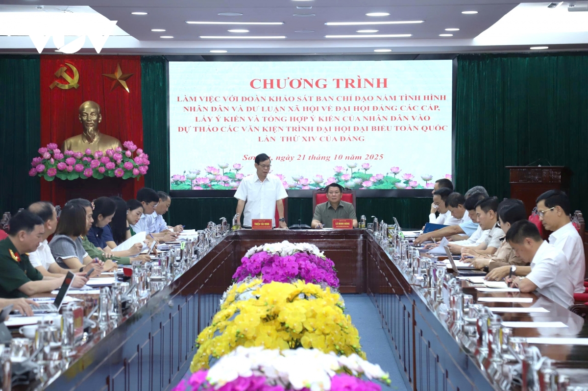 Phát biểu tại cuộc làm việc, ông Triệu Tài Vinh, Phó Trưởng ban Tuyên giáo và Dân vận Trung ương, Trưởng đoàn khảo sát đã ghi nhận và đánh giá cao công tác nắm tình hình nhân dân và dư luận xã hội về Đại hội Đảng bộ các cấp, việc lấy ý kiến góp ý của cán bộ, đảng viên và nhân dân vào dự thảo các văn kiện đại hội tại Sơn La.