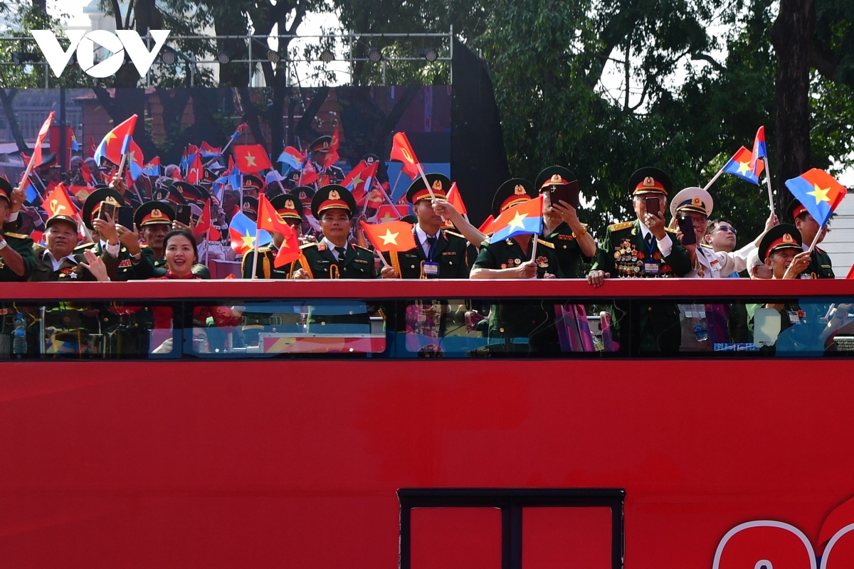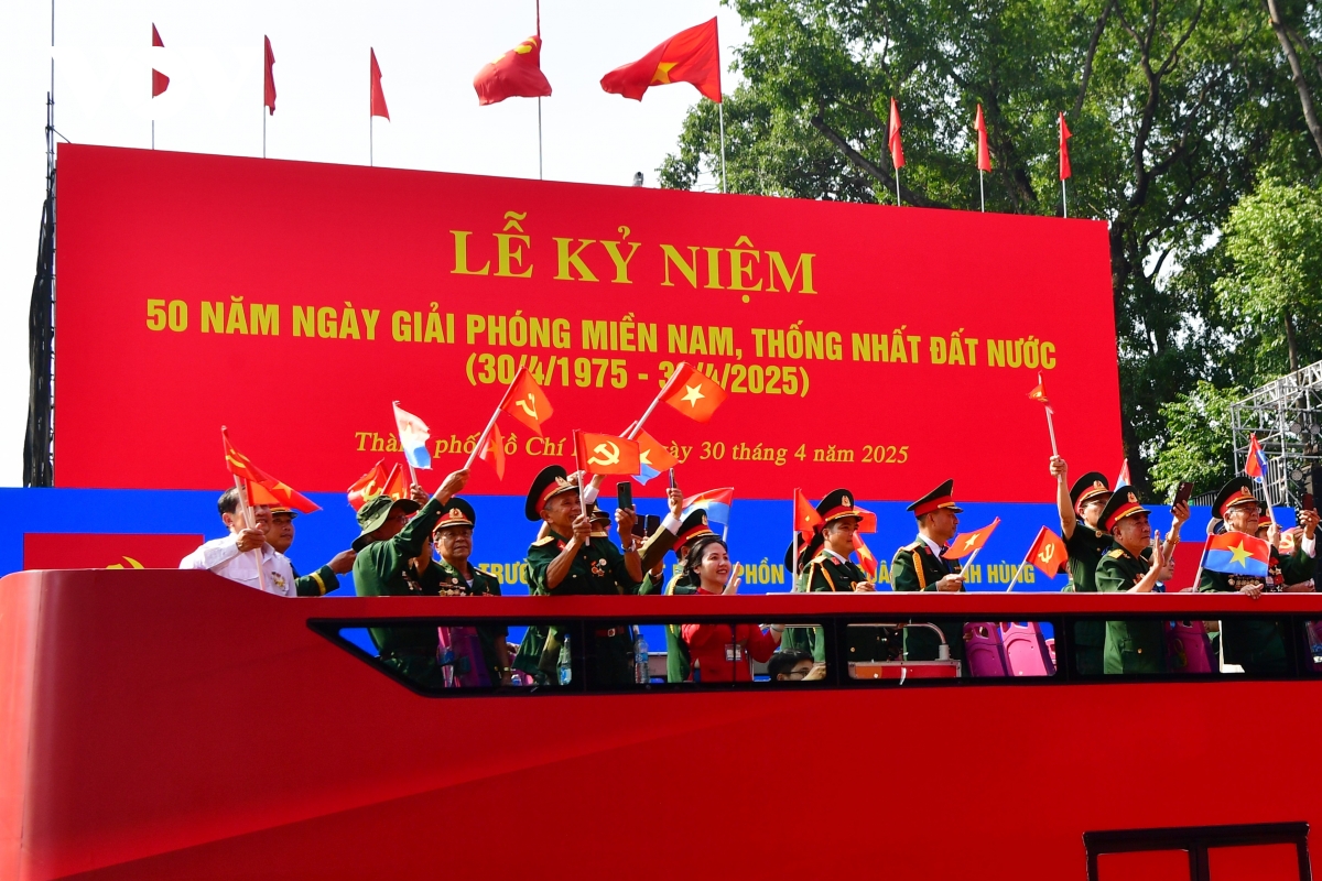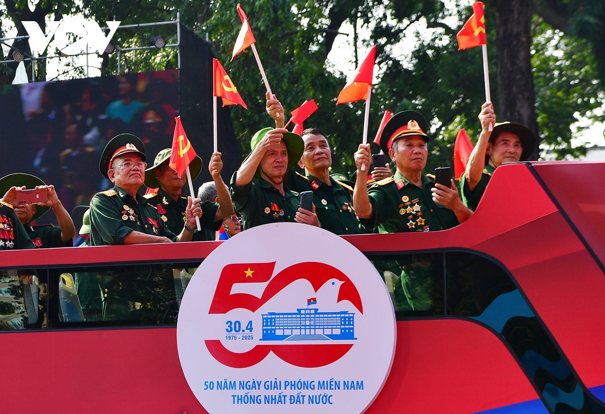 VOV.VN - Khối Tôn vinh các Anh hùng lực lượng vũ trang nhân dân, Anh hùng lao động và nhân chứng lịch sử gồm 350 đại biểu lần đầu xuất hiện và diễu qua khán đài trên xe buýt 2 tầng trong lễ kỷ niệm 50 năm Ngày Giải phóng miền Nam, thống nhất đất nước (30/4/1975-30/4/2025).