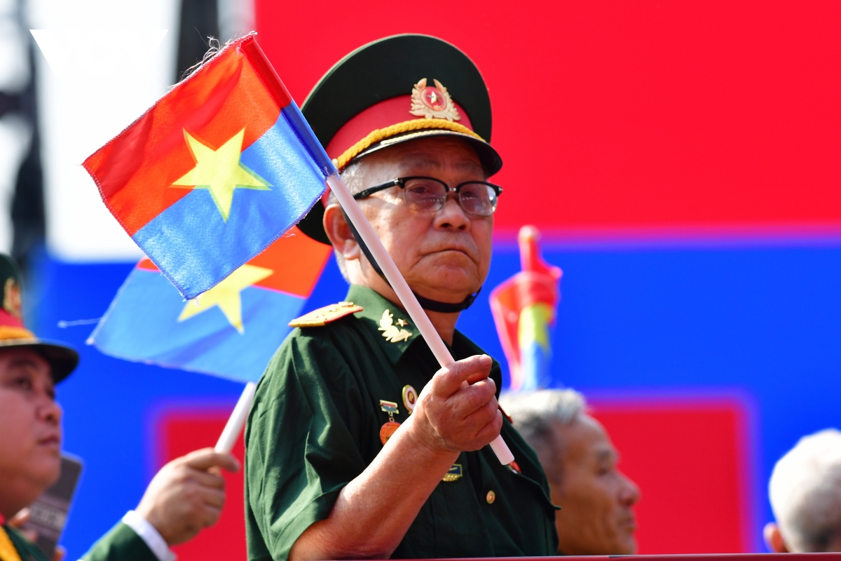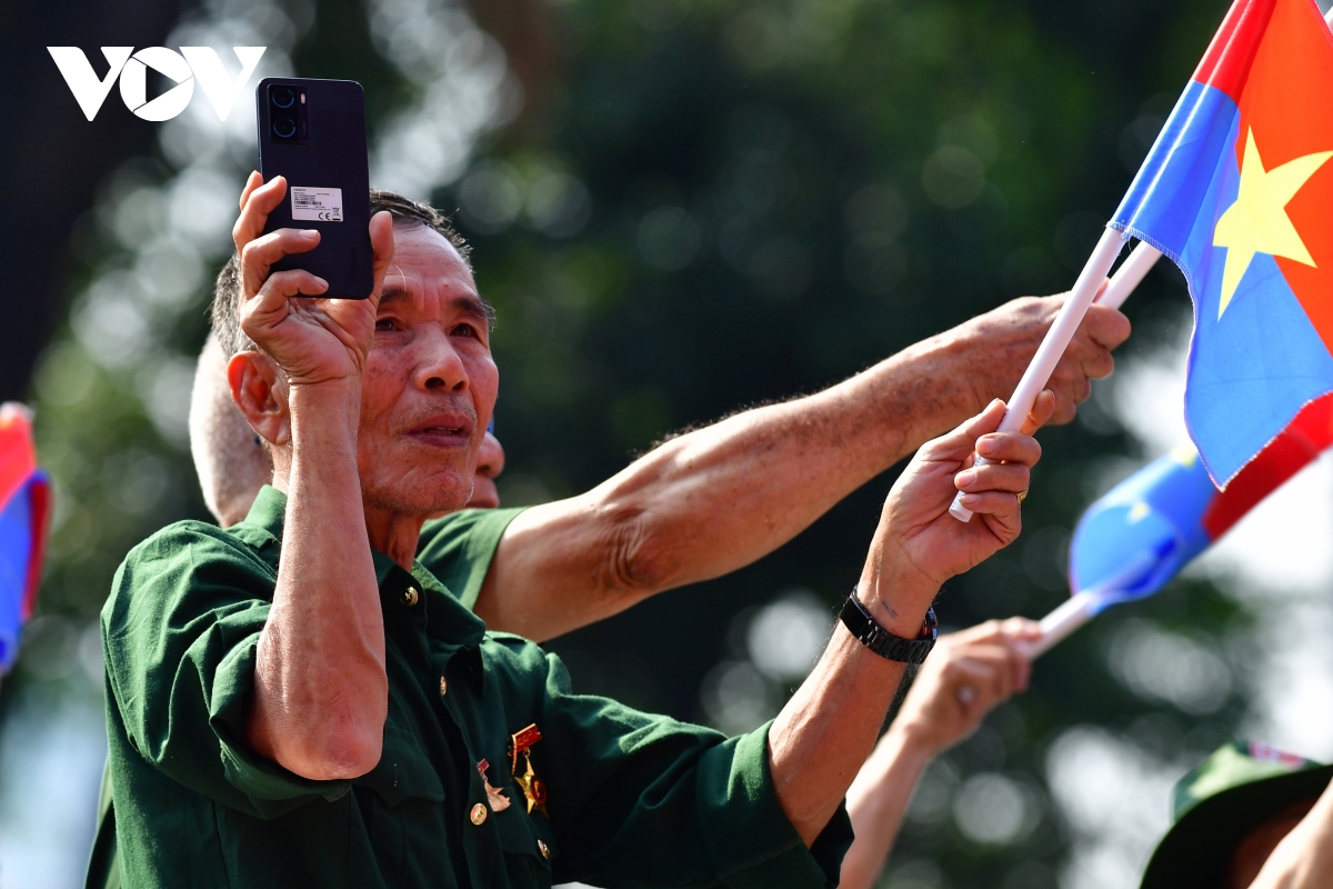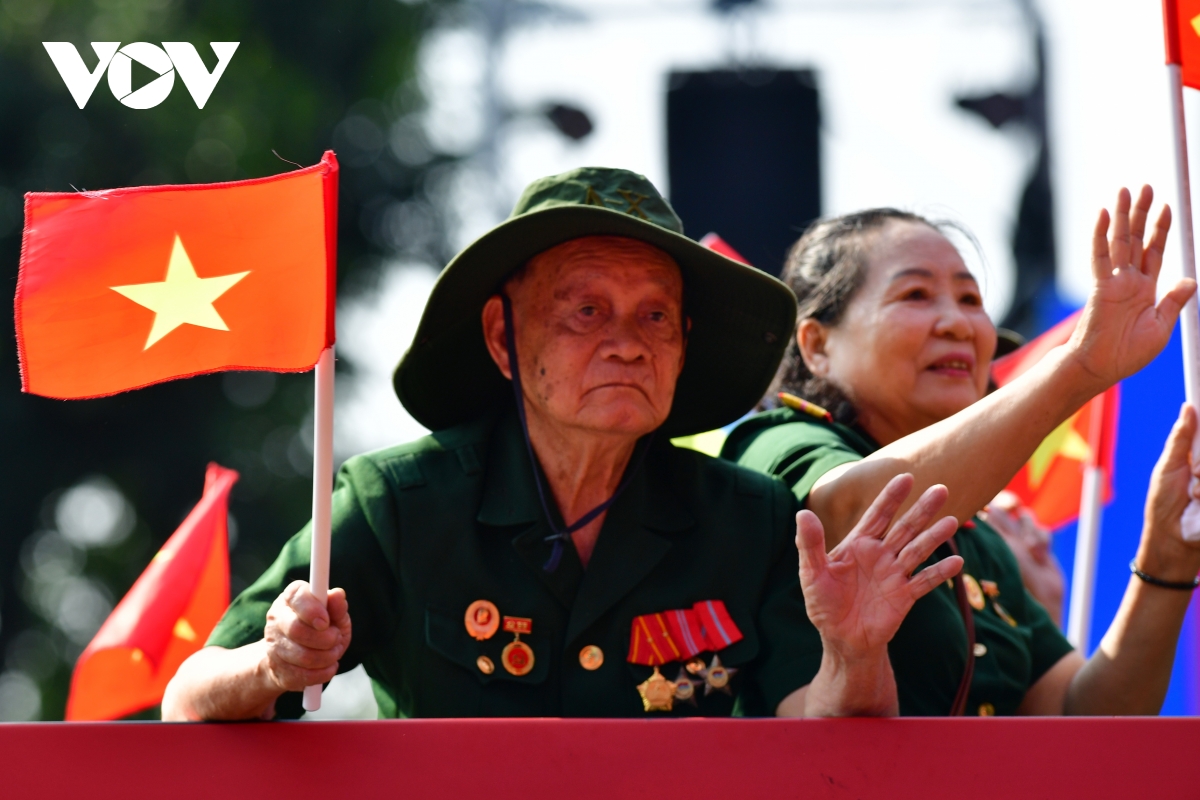 Các đại biểu Khối Tôn vinh các Anh hùng lực lượng vũ trang nhân dân, Anh hùng lao động và nhân chứng lịch sử rạng rỡ vẫy cờ khi tiến qua khán đài.