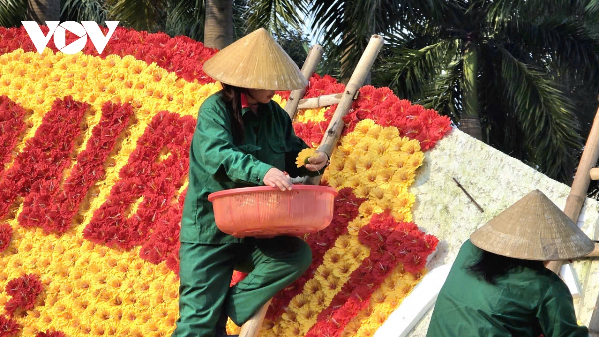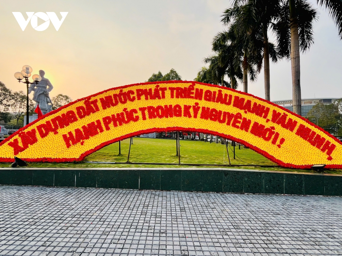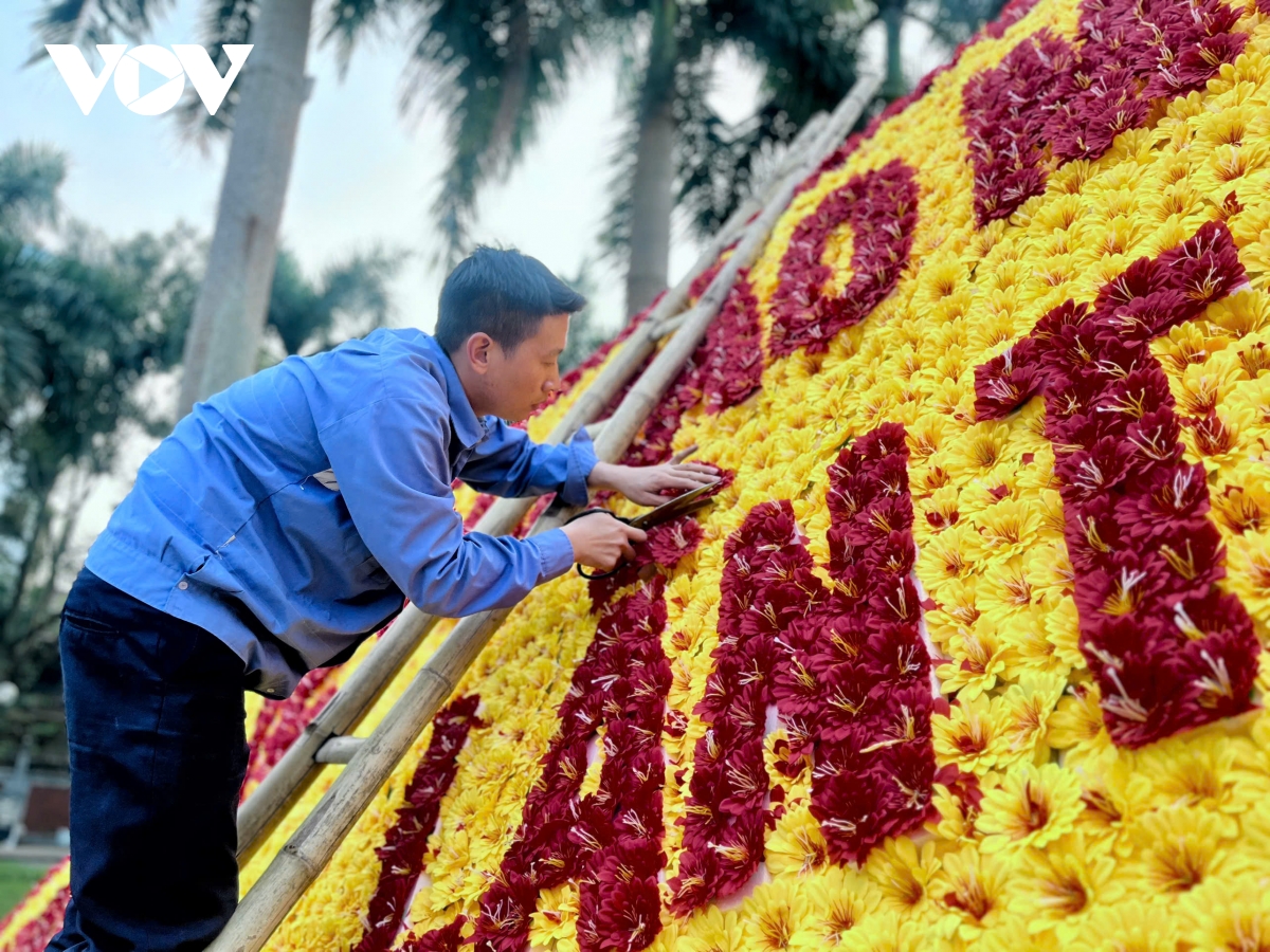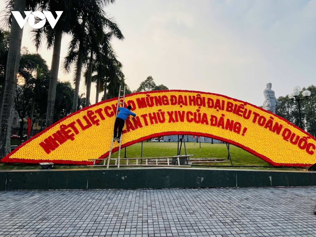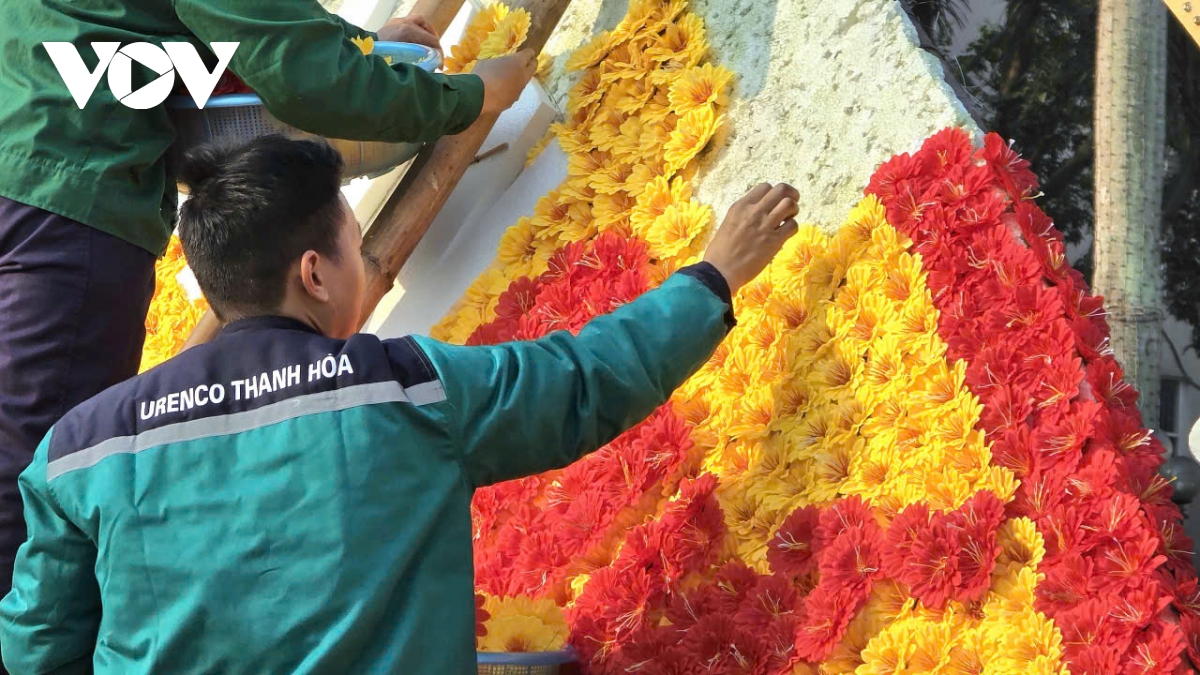 Tại phường Hạc Thành, bức trướng hoa chào mừng Đại hội đại biểu toàn quốc lần thứ XIV của Đảng đang được các công nhân khẩn trương hoàn thiện. Từng khung sắt được dựng chắc chắn, hoa tươi kết thành mảng lớn với gam đỏ – vàng chủ đạo, nổi bật dòng chữ chào mừng trang trọng.