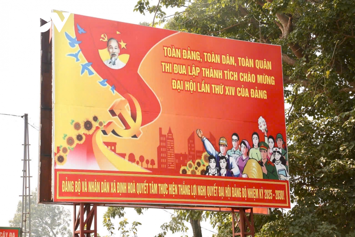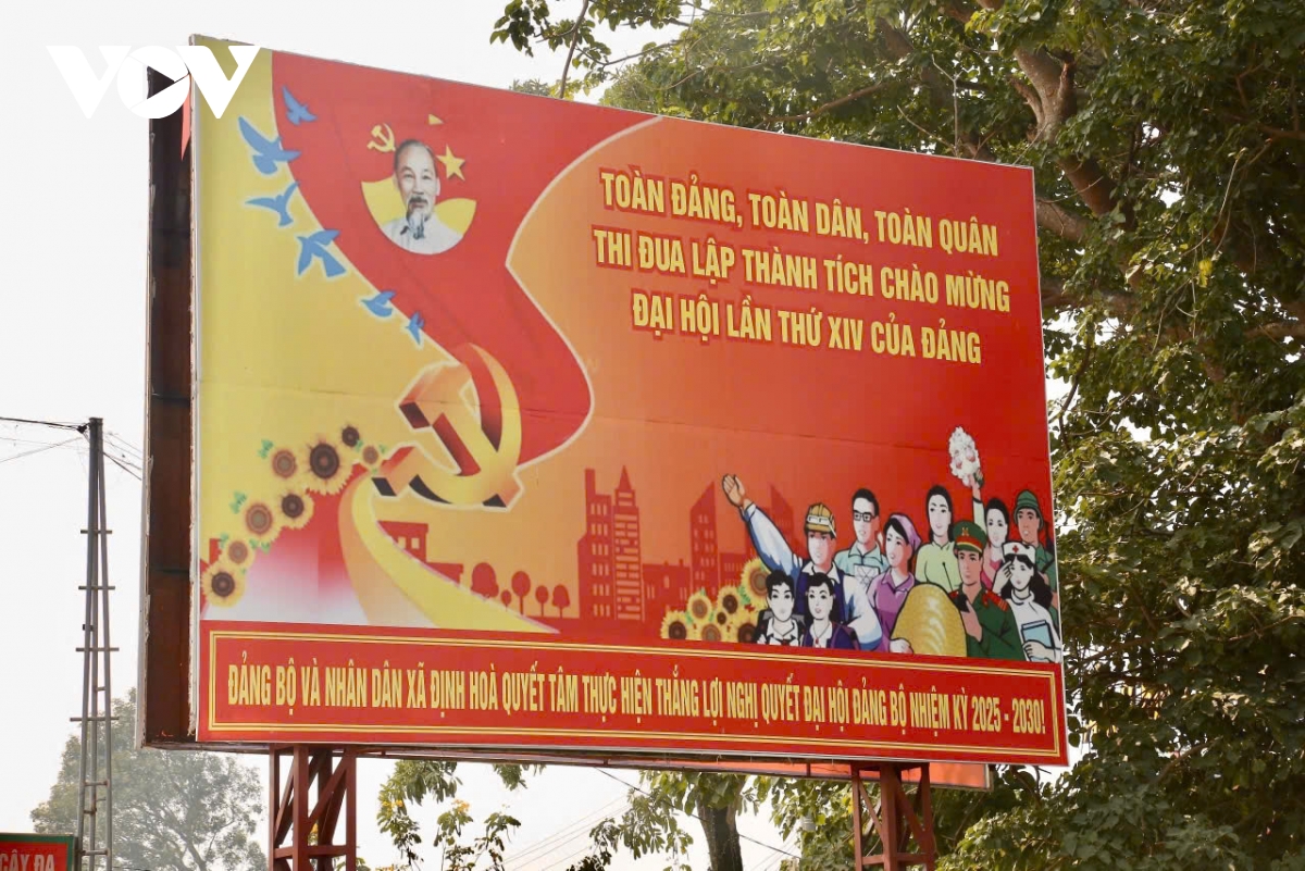 Tại xã Định Hòa, các cụm pano tuyên truyền được bố trí trang trọng, thể hiện sự trân trọng và kỳ vọng vào Đại hội Đảng lần thứ XIV.