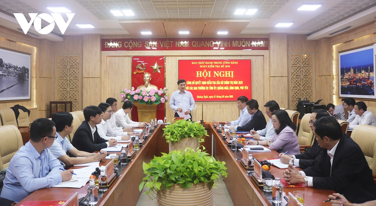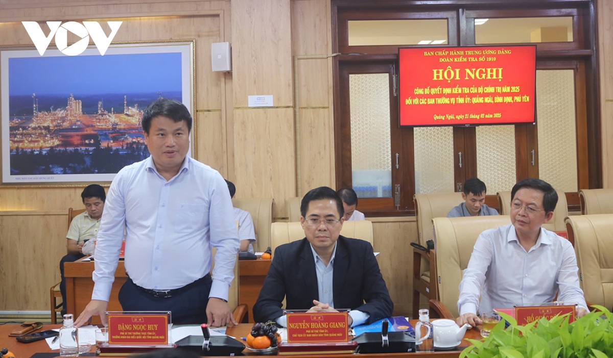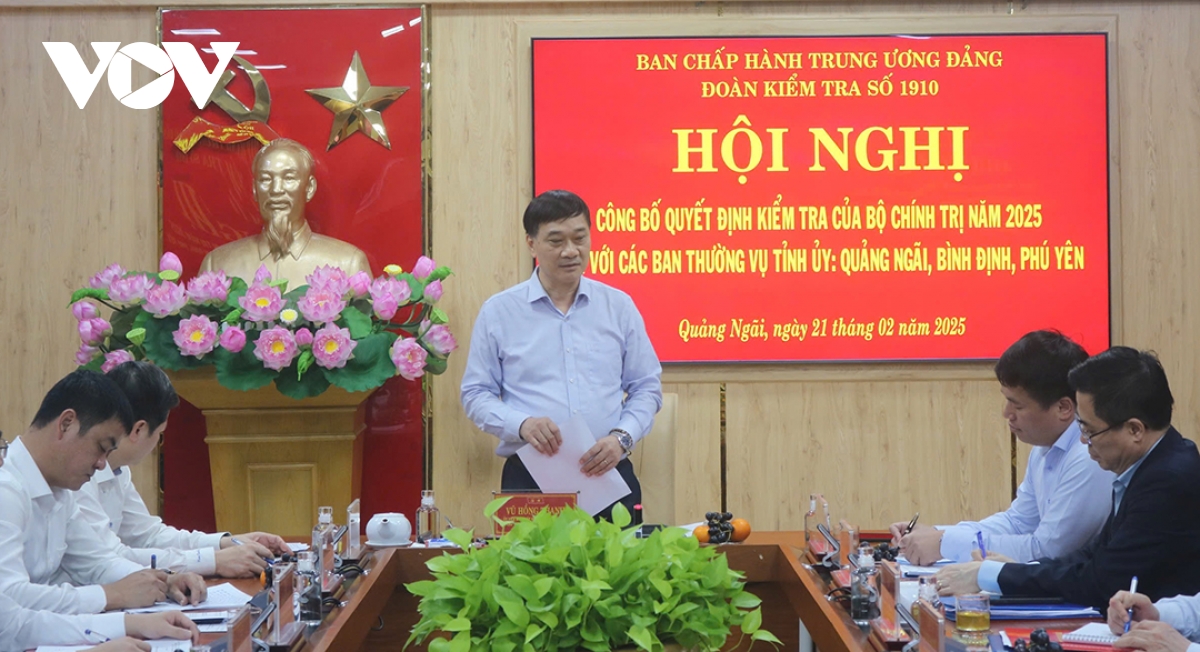 VOV.VN - Chiều 21/2, tại tỉnh Quảng Ngãi, ông Vũ Hồng Thanh, Phó Chủ tịch Quốc hội, Phó Trưởng đoàn Thường trực Đoàn kiểm tra số 1910 chủ trì Hội nghị công bố Quyết định thành lập Đoàn kiểm tra và Kế hoạch kiểm tra đối với các Ban Thường vụ Tỉnh ủy Quảng Ngãi, Bình Định và Phú Yên.