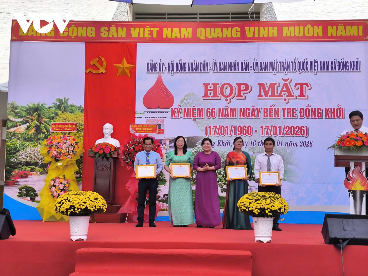 Tại buổi họp mặt, các đại biểu cùng hồi tưởng lại lịch sử hào hùng của phong trào "Đồng Khởi" năm xưa. Cách nay 66 năm, thực hiện Nghị quyết số 15 về "tăng cường đoàn kết, kiên quyết đấu tranh giữ gìn hòa bình, thực hiện thống nhất nước nhà" và chủ trương của hội nghị liên Tỉnh ủy Trung Nam Bộ, Tỉnh ủy Bến Tre đã lãnh đạo nhân dân vùng lên làm nên cuộc Đồng Khởi thần kỳ vào ngày 17/01/1960, mở màn tại ba xã: Định Thủy, Bình Khánh, Phước Hiệp, huyện Mỏ Cày (nay là xã Đồng Khởi, tỉnh Vĩnh Long), giành thắng lợi lớn, sau đó nhanh chóng lan ra toàn tỉnh, trở thành cao trào "Đồng Khởi" trên khắp cả miền Nam, Tây Nguyên và một số nơi ở Trung Trung Bộ.