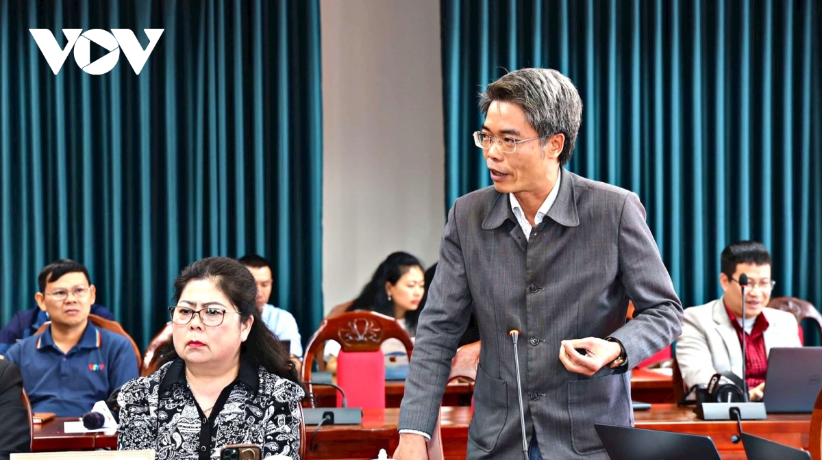 Nhà báo Mai Văn Bảo đại diện Báo Nhân dân tại tỉnh Lâm Đồng nêu câu hỏi trong buổi họp báo.