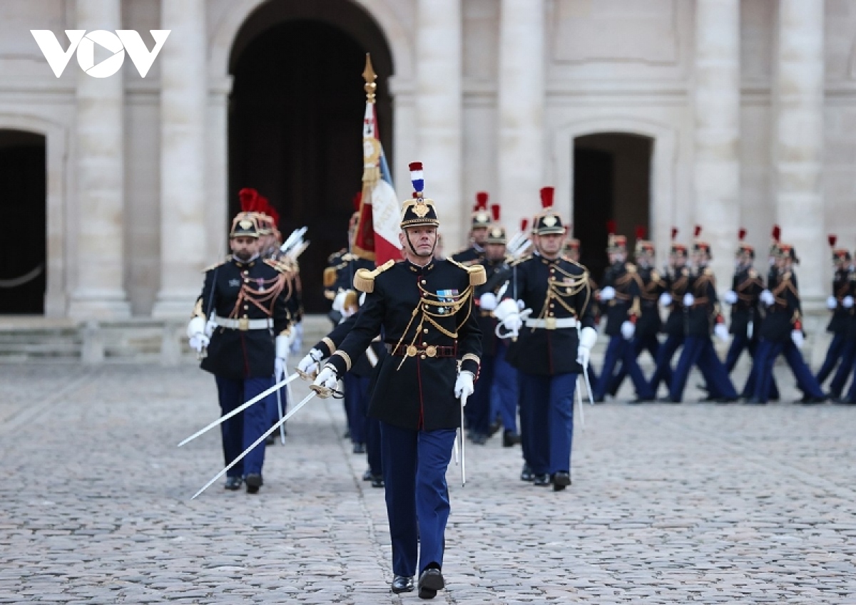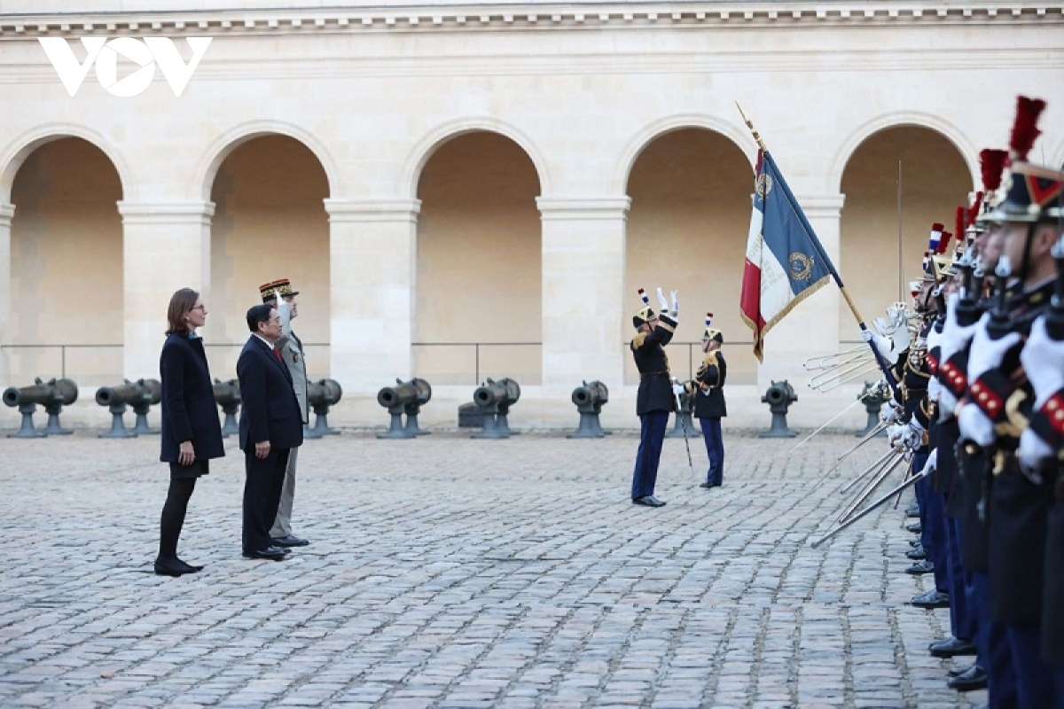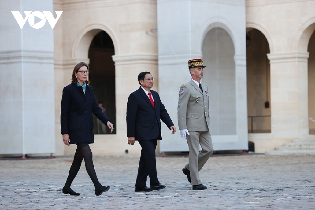 Trong không khí trang nghiêm, khi Thủ tướng Phạm Minh Chính vào Đoàn đại biểu cấp cao Việt Nam tiến vào sân chính của Điện Invalides quốc thiều Việt Nam và quốc thiều Pháp được cử lên vang vọng. Sau đó, Bộ trưởng Amelie de Montchallin mời Thủ tướng Chính phủ Phạm Minh Chính duyệt đội danh dự. Sau khi Đội danh dự diễu hành để Thủ tướng Phạm Minh Chính duyệt, Đội trưởng Đội quân nhạc tiến đến cất lời chào Thủ tướng Chính phủ Phạm Minh Chính.