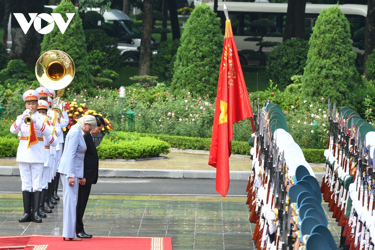 Chủ tịch nước Lương Cường mời Toàn quyền Australia Sam Mostyn duyệt Đội danh dự QĐND Việt Nam.