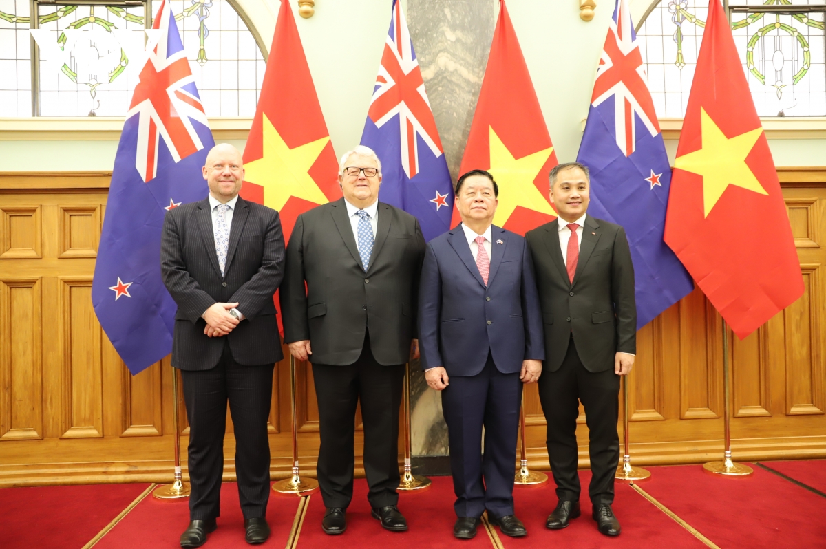 Từ phải qua: Đại sứ Việt Nam tại New Zealand Pha Minh Giang, Trưởng ban Tuyên giáo và Dân vận Trung ương Nguyễn Trọng Nghĩa, Chủ tịch Quốc hội New Zealand Gerry Brownlee, Thứ trưởng Bộ Ngoại giao và Thương mại New Zealand Grahame Morton.