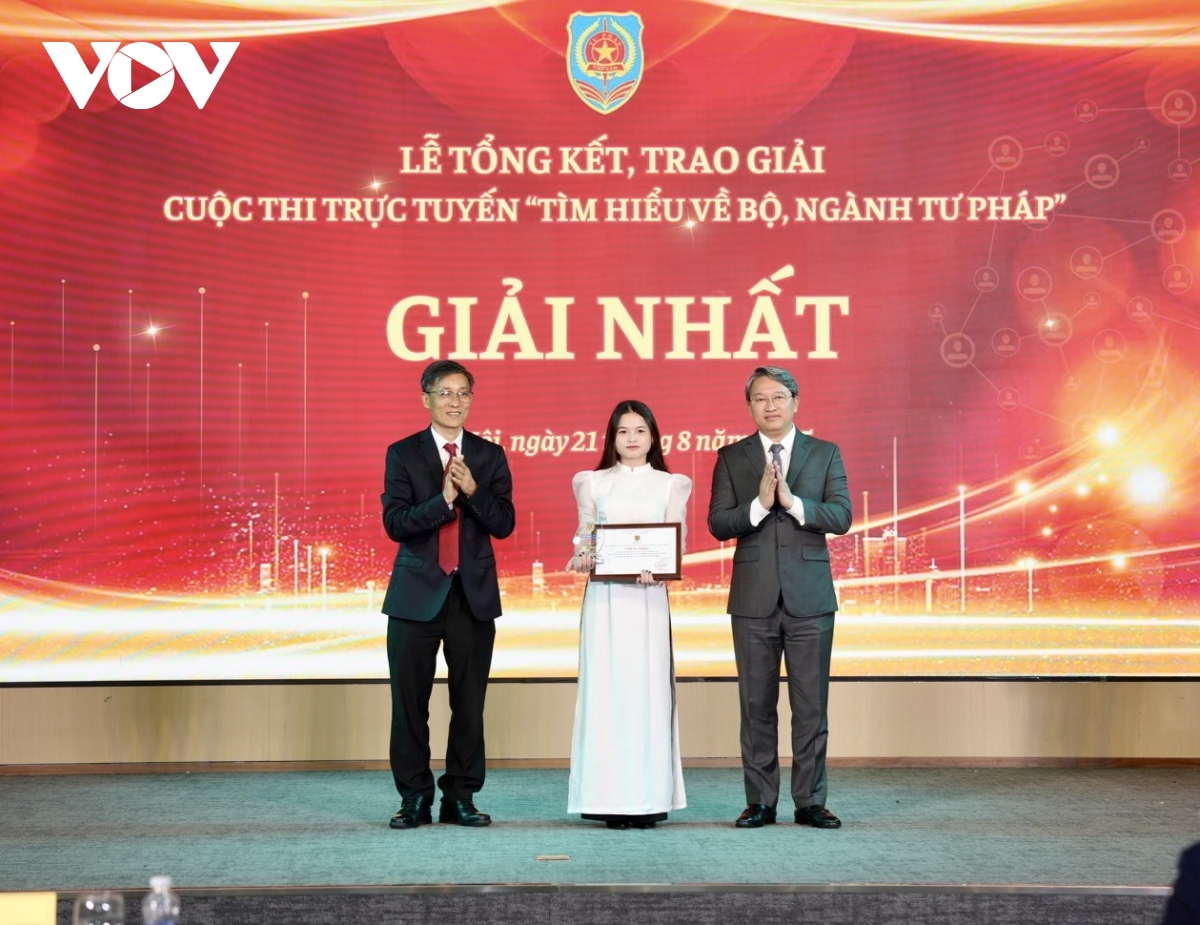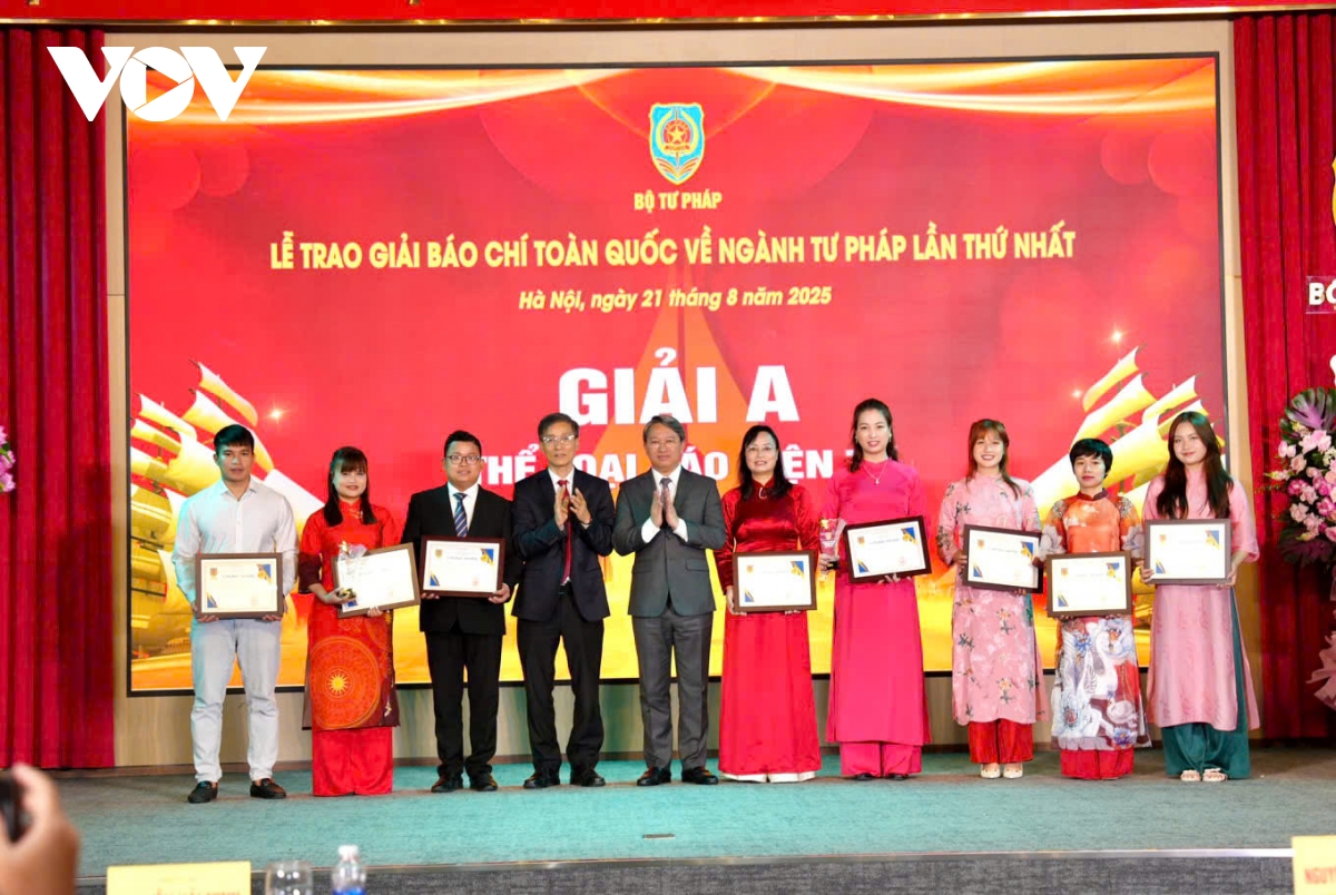 VOV.VN - Ngày 21/8 tại Hà Nội, Bộ Tư pháp tổ chức lễ trao giải báo chí toàn quốc về ngành tư pháp lần thứ nhất và cuộc thi trực tuyến “Tìm hiểu về bộ, ngành tư pháp”. Đây là hoạt động thiết thực kỷ niệm 80 năm ngày Truyền thống của ngành Tư pháp Việt Nam (28/8/1945 – 28/8/2025) và Đại hội Thi đua yêu nước ngành Tư pháp lần thứ VI, Bộ Tư pháp.