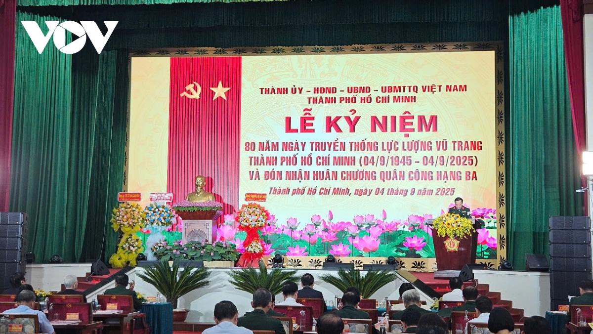 VOV.VN - Chiều 4/9, TP.HCM tổ chức Lễ kỷ niệm 80 năm Ngày truyền thống lực lượng vũ trang (LLVT) và đón nhận Huân chương Quân công hạng Ba vì “thành tích đặc biệt xuất sắc trong huấn luyện, sẵn sàng chiến đấu, xây dựng lực lượng, củng cố quốc phòng, góp phần vào sự nghiệp xây dựng và bảo vệ Tổ quốc”.