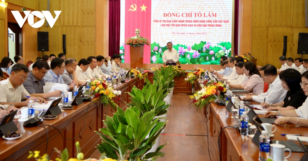 Tổng Bí thư Tô Lâm nêu rõ: “Rà soát lại các chủ trương về công tác tuyên giáo và dân vận đã được đề ra tại Đại hội XIII của Đảng, tập trung hoàn thành không để bỏ sót nhiệm vụ nào. Trước mắt tập trung xây dựng trình Bộ Chính trị, Ban Bí thư 14 Đề án theo chương trình công tác năm 2025 đảm bảo tiến độ, chất lượng. Tôi đề nghị các đồng chí tiếp tục rà soát, bổ sung, hoàn thiện quy chế, quy trình công tác đảm bảo kết hợp hài hòa, có tính biện chứng giữa công tác tuyên giáo và dân vận trong mô hình tổ chức bộ máy mới. Rà soát, bổ sung, hoàn thiện quy chế, cơ chế phối hợp giữa Ban Tuyên giáo Dân vận Trung ương với các Ban tham mưu chiến lược của Đảng, tập trung cao độ thực hiện tốt nhiệm vụ tổ chức Đại hội Đảng các cấp tiến tới Đại hội Đảng toàn quốc lần thứ XIV.