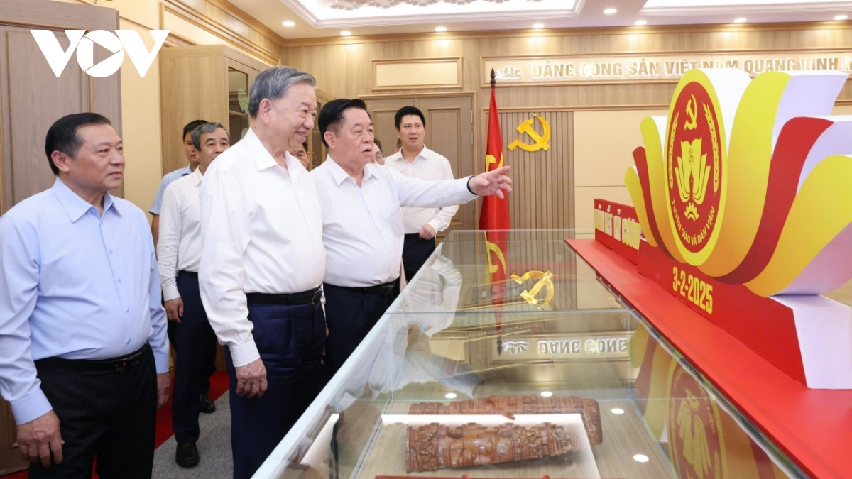 VOV.VN - Tổng Bí thư Tô Lâm tới thăm và chủ trì buổi làm việc với Ban Tuyên giáo và Dân vận Trung ương về tình hình thực hiện nhiệm vụ sau hợp nhất đến nay.