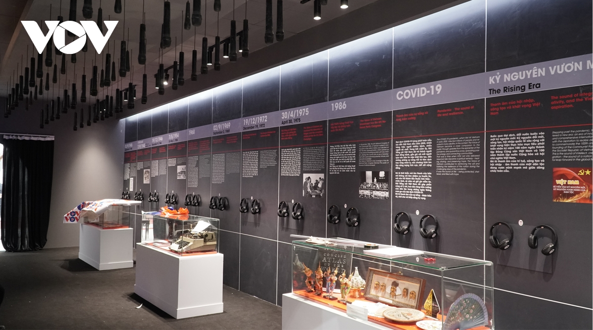 Trạm dừng thứ ba là “Thanh âm lịch sử”. Đây là "trái tim" của triển lãm, mang tới những trải nghiệm thanh âm giàu cảm xúc. Hàng chục chiếc micro qua nhiều thế hệ được treo trên trần, tạo thành bức tranh ánh sáng huyền ảo. Khách tham quan được lắng đọng trong 12 dấu mốc thời gian lịch sử qua âm thanh: tiếng Bác Hồ đọc Tuyên ngôn Độc lập, lời hiệu triệu Toàn quốc kháng chiến, khúc ca chiến thắng Điện Biên Phủ, bản tin giải phóng Sài Gòn 30/4/1975, đến thanh âm kiên cường của cả nước trong đại dịch Covid-19 và âm thanh của trí tuệ, sáng tạo, hội nhập trong thời đại mới.