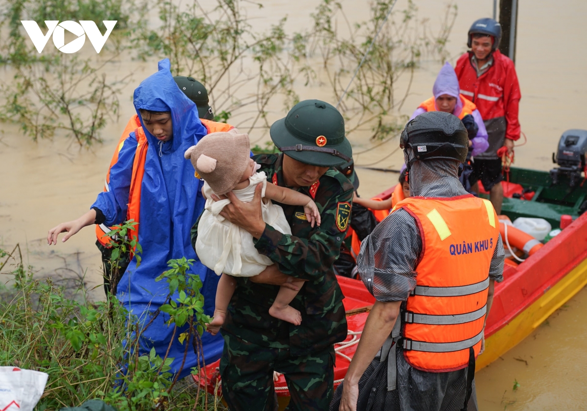 Bộ đội hỗ trợ đưa một trẻ em ra khỏi vùng ngập lụt.