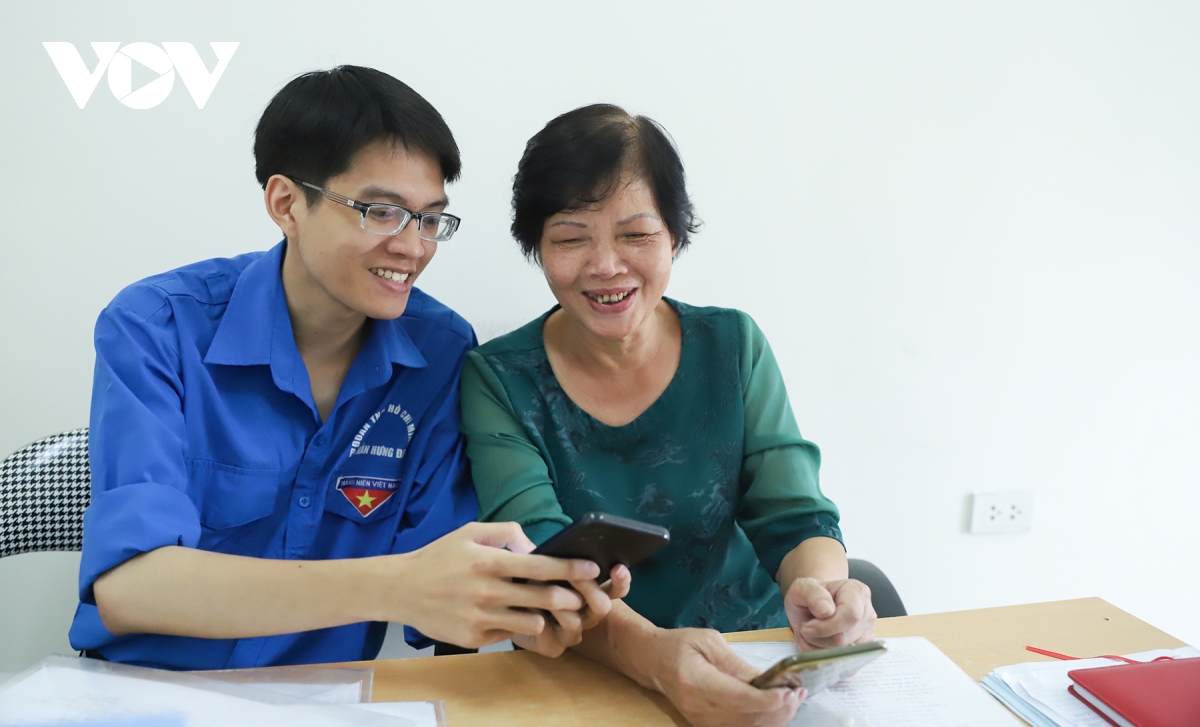 Đoàn viên thanh niên hướng dẫn người dân tham gia góp ý vào Dự thảo sửa đổi, bổ sung Hiến pháp 2013 trên ứng dụng VNeID