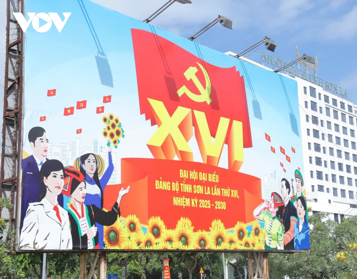 Những ngày này, khắp các tuyến phố tại Sơn La rợp sắc cờ hoa, pa nô, băng rôn chào mừng Đại hội đại biểu Đảng bộ tỉnh lần thứ XVI, nhiệm kỳ 2025-2030. Tại các khu vực trung tâm, những tấm áp phích hay màn hình led cỡ lớn tạo thêm điểm nhấn trực quan về sự kiện chính trị trọng đại này.