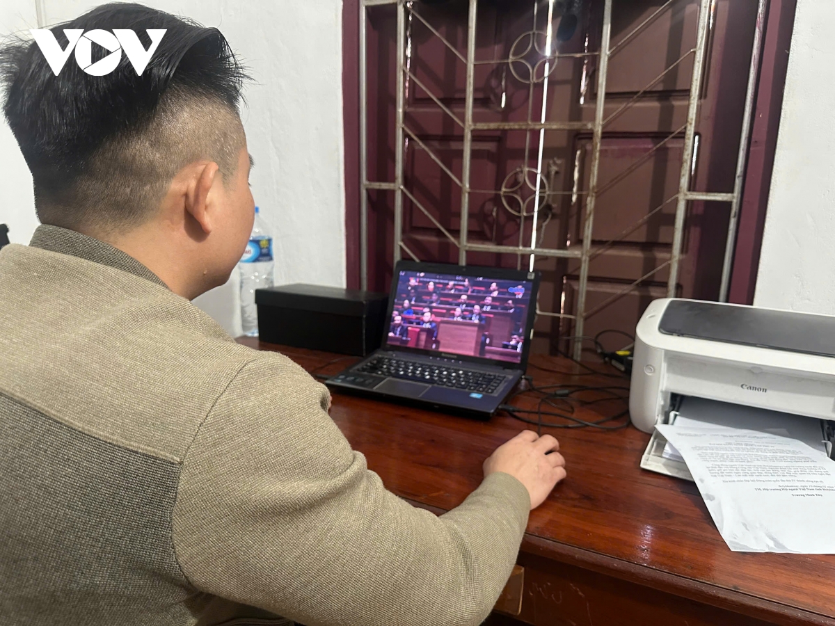 Anh Nguyễn Công Chánh theo dõi Lễ khai mạc Đại hội lần thứ XIV của Đảng qua đường truyền internet bằng máy tính xách tay.