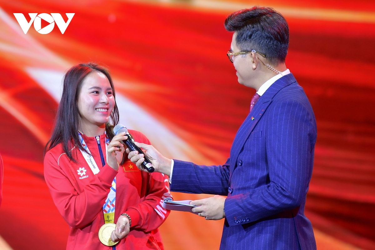 Các VĐV tiêu biểu của thể thao Việt Nam, những người vừa mang vinh quang về cho Tổ quốc tại SEA Games 33 lên sân khấu giao lưu tại Đại hội Thi đua yêu nước lần thứ XI.