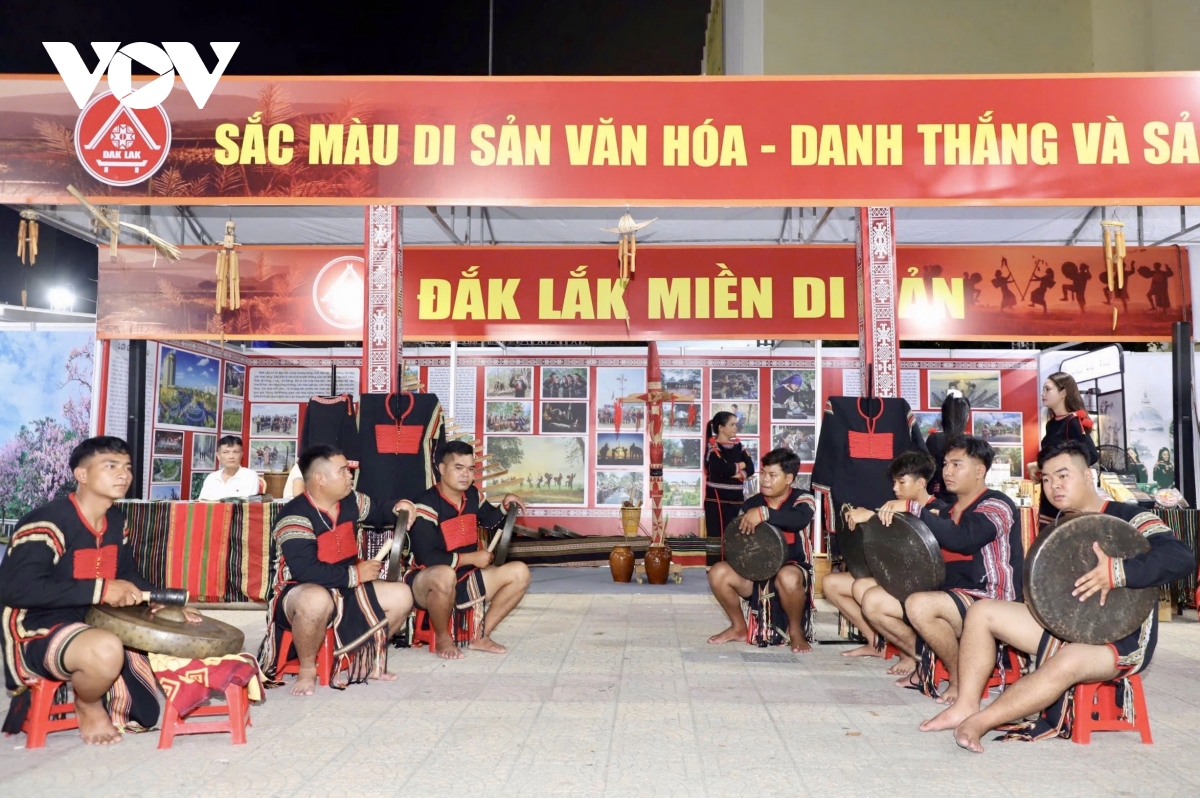 Các thành viên câu lạc bộ cồng chiêng xã Cuôr Đăng tham gia biểu diễn tại chương trình giới thiệu văn hoá Đắk Lắk.