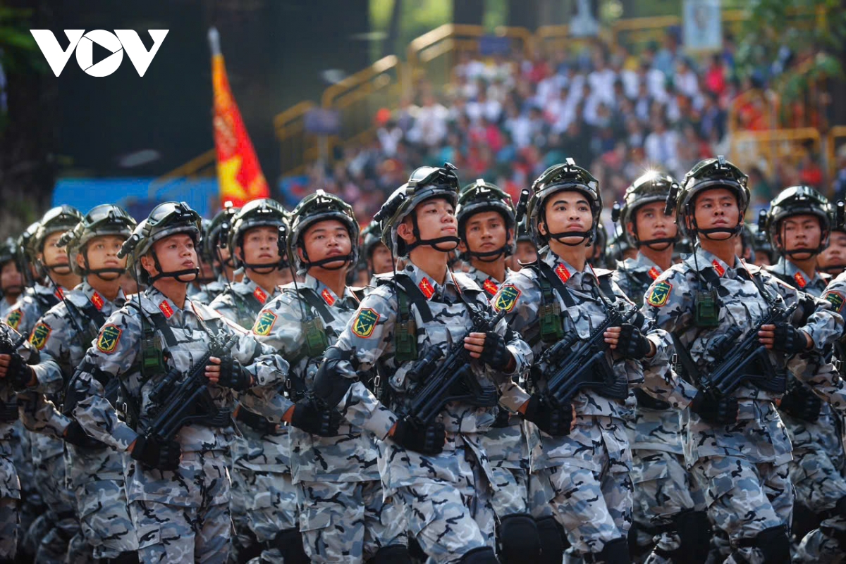 Tiếp đó là các khối diễu binh. Trong ảnh: Khối nam Chiến sĩ Cảnh sát cơ động dự bị chiến đấu