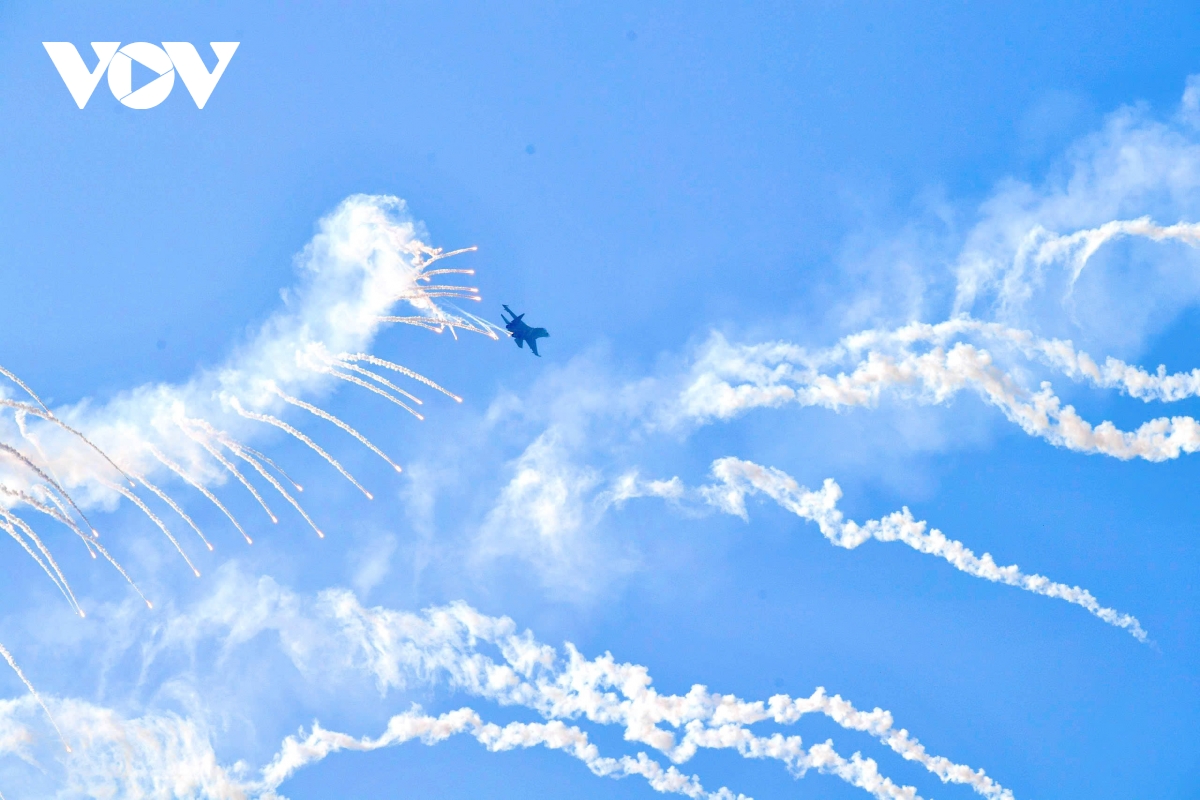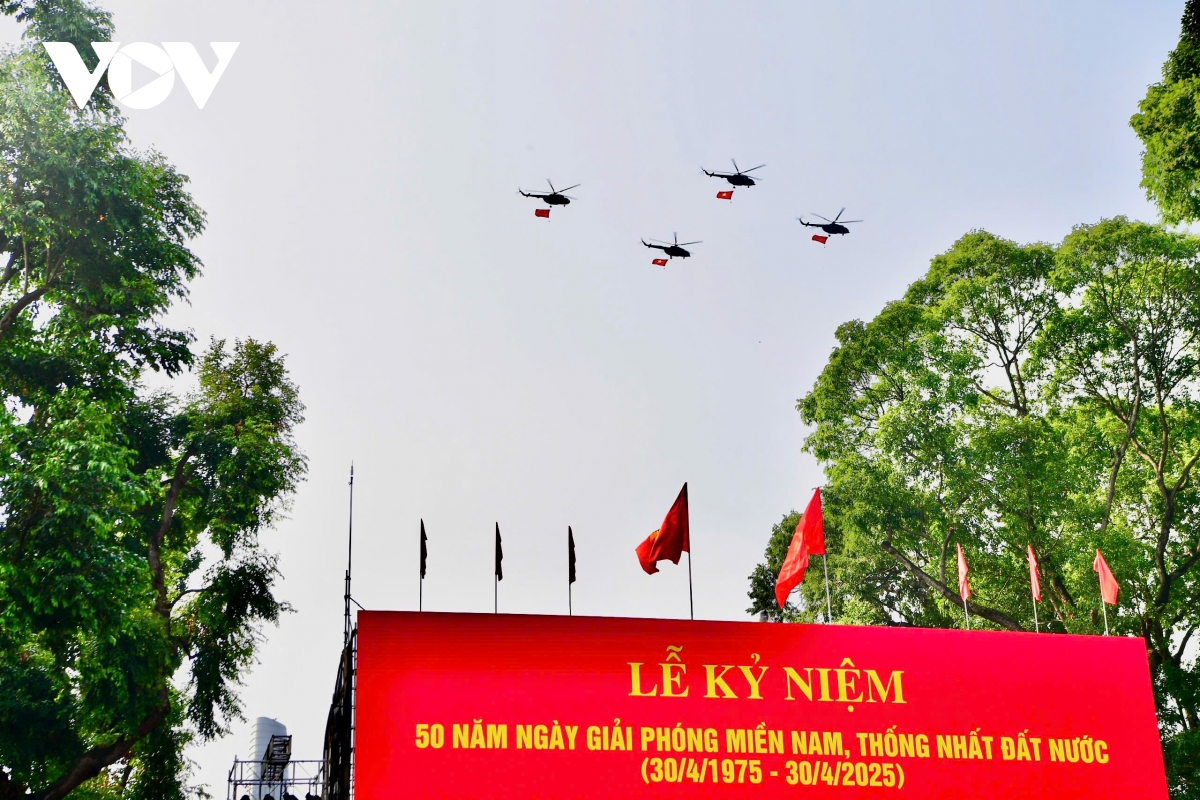 Tiếp đó, phi đội máy bay trực thăng kéo cờ Đảng, cờ Tổ quốc cùng phi đội máy bay tiêm kích chiến đấu của Quân đội nhân dân Việt Nam nhào lộn thả bẫy mồi trên bầu trời trung tâm Thành phố Hồ Chí Minh.