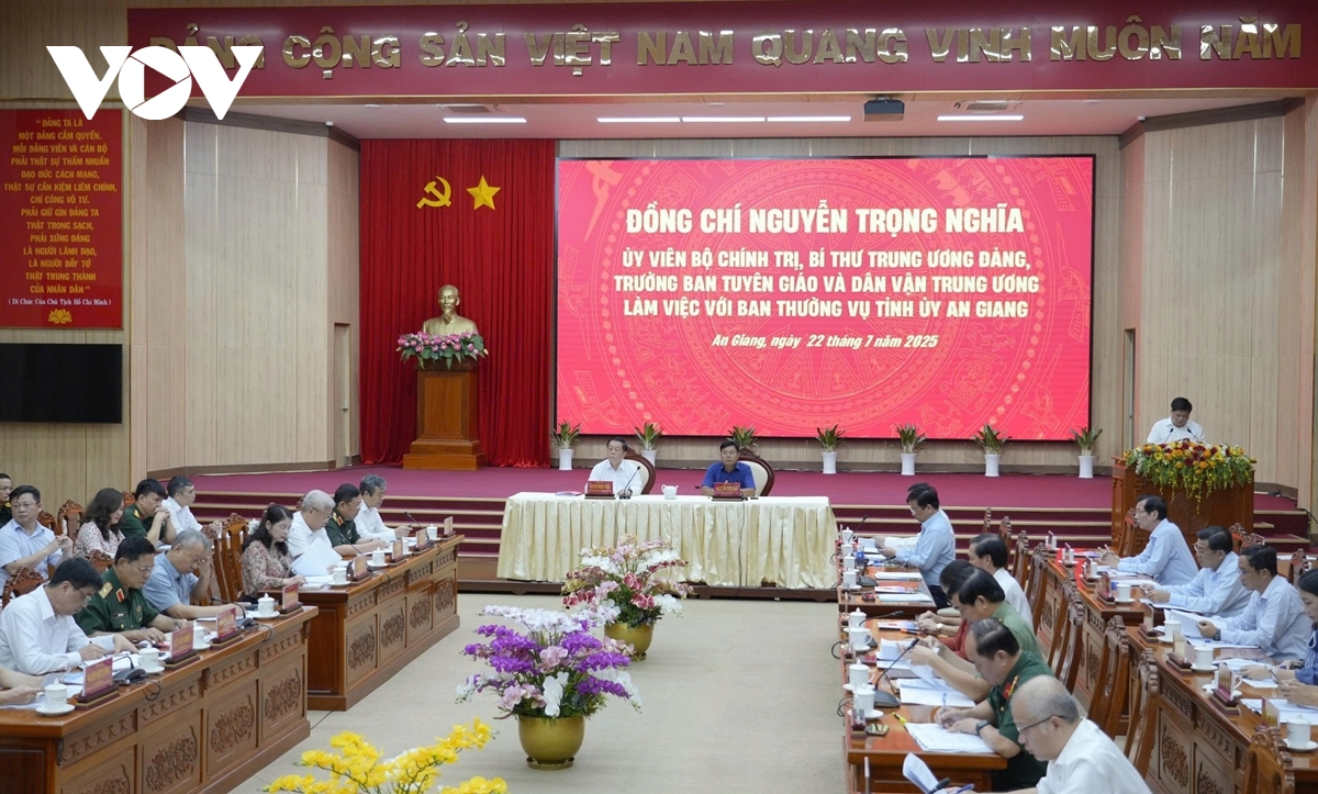 VOV.VN - Sau khi đi kiểm tra thực tế tại 3 đặc khu Phú Quốc, Thổ Châu và Kiên Hải, hôm nay (22/7), đoàn công tác của Trung ương do Ủy viên Bộ Chính trị, Bí thư Trung ương Đảng, Trưởng ban Tuyên giáo và Dân vận Trung ương Nguyễn Trọng Nghĩa làm trưởng đoàn đã đến làm việc với Ban Thường vụ Tỉnh ủy An Giang.