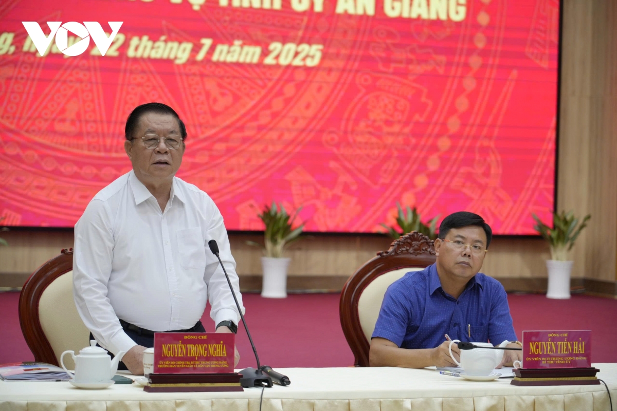 Ông Nguyễn Trọng Nghĩa đánh giá cao sự chủ động, quyết liệt của tỉnh An Giang trong thời gian qua, nhất là trong công tác sắp xếp tổ chức bộ máy và phát triển kinh tế - xã hội. Đồng thời đề nghị thời gian tới, tỉnh An Giang cần tập trung triển khai hiệu quả các nghị quyết Hội nghị Trung ương 11, Trung ương 12 và các kết luận của Trung ương, Bộ Chính trị, Ban Bí thư; tiếp tục phát huy những kết quả đã đạt được trong thực hiện mô hình bộ máy chính quyền hai cấp, góp phần xây dựng hệ thống chính trị vững mạnh, phục vụ phát triển kinh tế - xã hội bền vững.