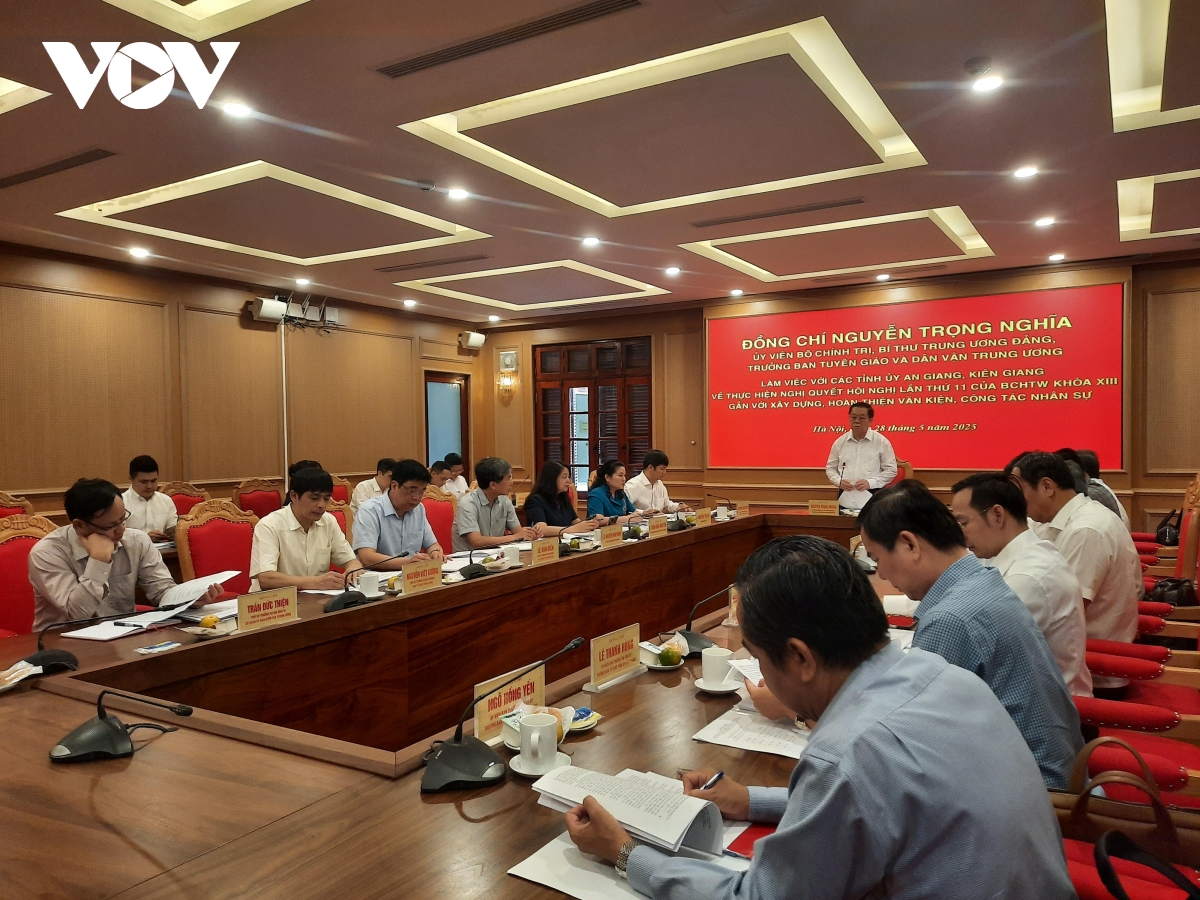 VOV.VN - Ngày 28/5, Ủy viên Bộ chính trị, Bí thư Trung ương Đảng, Trưởng Ban Tuyên giáo và Dân vận Trung ương Nguyễn Trọng Nghĩa làm việc với Tỉnh ủy An Giang và Kiên Giang về thực hiện Nghị quyết Hội nghị lần thứ 11 của Ban chấp hành Trung ương Khóa 13 gắn với xây dựng, hoàn thiện văn kiện, công tác nhân sự.