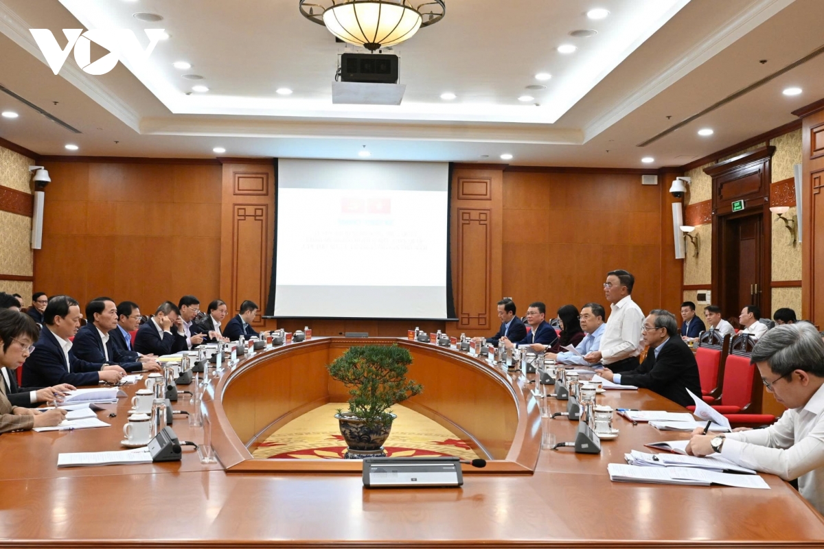 Toàn cảnh cuộc họp Thường trực Tiểu ban Tổ chức phục vụ Đại hội 14 nhằm rà soát tiến độ, nhiệm vụ và công tác chuẩn bị.