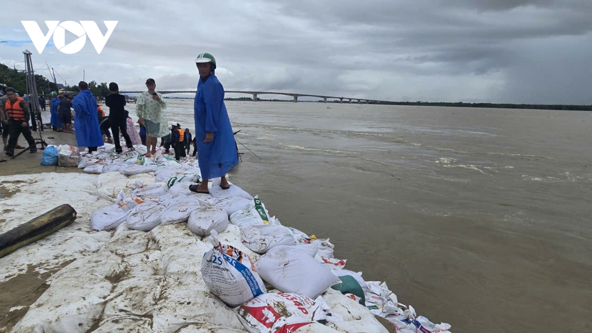 Kè sông Thu Bồn đoạn qua xã Duy Nghĩa (huyện Duy Xuyên, tỉnh Quảng Nam cũ) bị sạt lở phải đắp tạm.