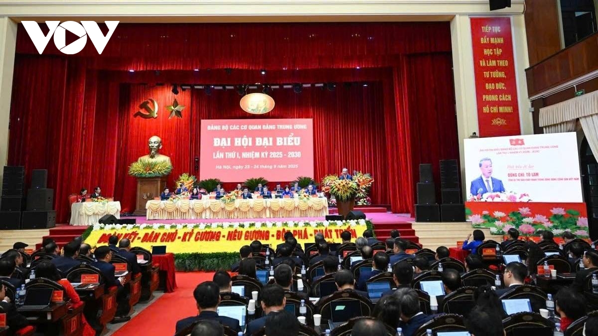 VOV.VN - Sáng 24/9, tại Hà Nội, Đại hội đại biểu Đảng bộ các cơ quan Đảng Trung ương lần thứ I, nhiệm kỳ 2025-2030 đã khai mạc trọng thể, với sự tham dự của 293 đại biểu chính thức đại diện cho hơn 8.700 đảng viên của 14 Đảng bộ trực thuộc Đảng bộ các cơ quan Đảng Trung ương. Tổng Bí thư Tô Lâm dự và phát biểu chỉ đạo Đại hội.