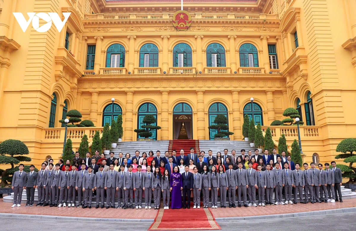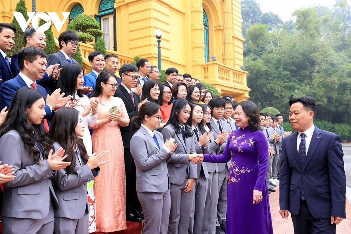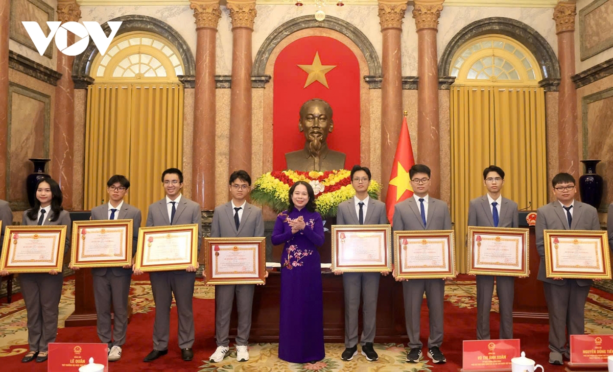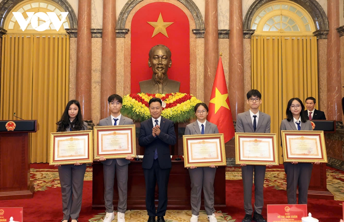 VOV.VN - Sáng 12/12, tại Phủ Chủ tịch, Phó Chủ tịch nước Võ Thị Ánh Xuân, Phó Chủ tịch thứ nhất Hội đồng Thi đua Khen thưởng Trung ương, gặp mặt và trao Huân chương Lao động cho học sinh đoạt giải Olympic và Khoa học kỹ thuật quốc tế năm 2025.