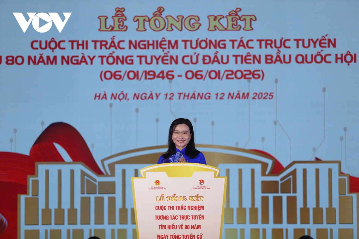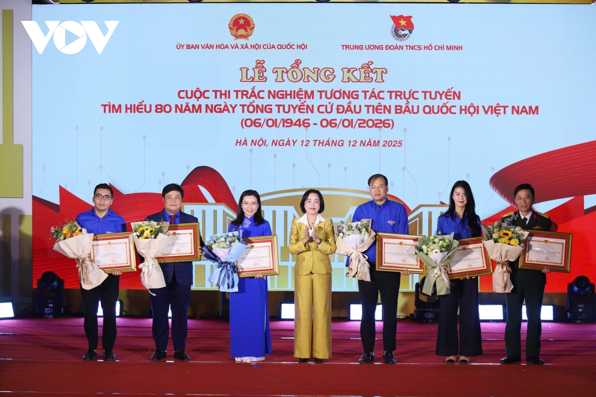 VOV.VN - Sáng12/12, tại Hà Nội, Ủy ban Văn hóa xã hội của Quốc hội phối hợp với Trung ương Đoàn TNCS Hồ Chí Minh tổ chức lễ tổng kết cuộc thi trắc nghiệm tương tác trực tuyến tìm hiểu về 80 năm Ngày Tổng tuyển cử đầu tiên bầu Quốc hội Việt Nam.