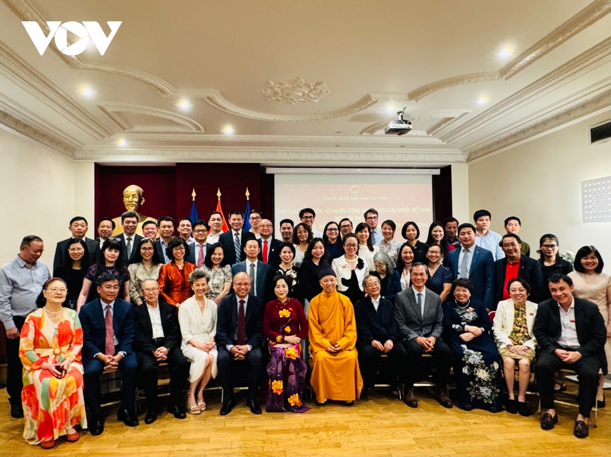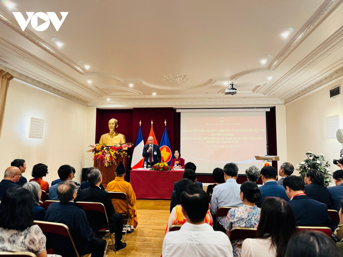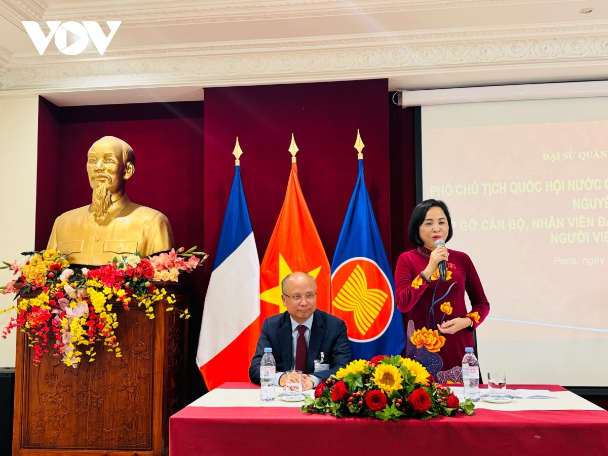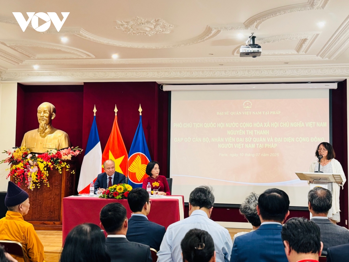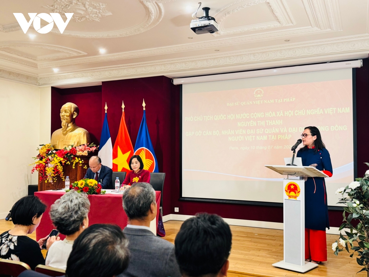 VOV.VN - Tối ngày 10/7, theo giờ địa phương, trong khuôn khổ Đại hội Đồng Liên minh nghị viện Pháp ngữ (APF) lần thứ 50, Phó Chủ tịch Quốc hội Nguyễn Thị Thanh đã đến thăm Đại sứ quán Việt Nam và gặp mặt đại biểu cộng đồng người Việt Nam tại Pháp.
