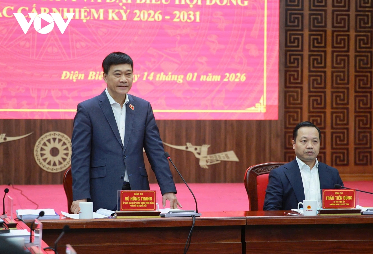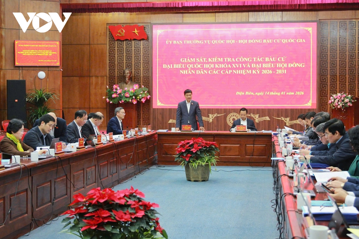 VOV.VN - Ngày 14/1, Đoàn giám sát, kiểm tra công tác bầu cử của Ủy ban Thường vụ Quốc hội do Phó Chủ tịch Quốc hội Vũ Hồng Thanh làm Trưởng đoàn đã làm việc với tỉnh Điện Biên về tình hình triển khai công tác chuẩn bị bầu cử đại biểu Quốc hội khóa XVI và đại biểu HĐND các cấp nhiệm kỳ 2026-2031.