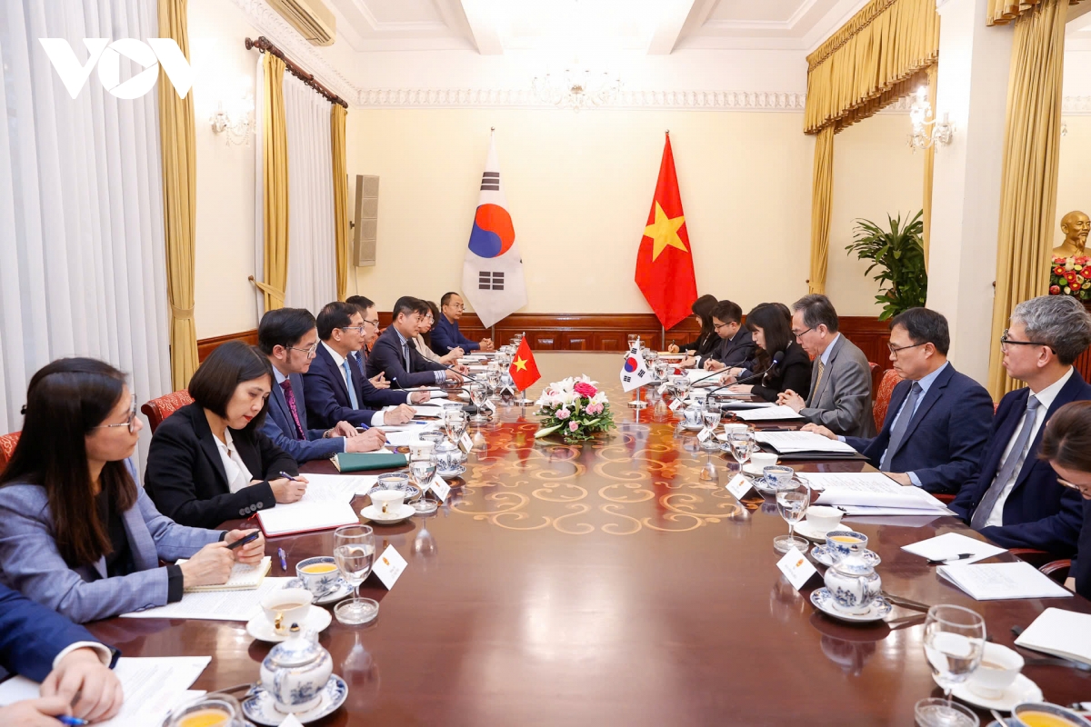 Về hợp tác kinh tế, hai bên nhất trí tiếp tục phấn đấu sớm hoàn thành mục tiêu kim ngạch thương mại song phương đạt 150 tỷ USD vào năm 2030 theo hướng cân bằng, bền vững; tạo điều kiện để hàng hóa hai nước tiếp cận thị trường của nhau. Phó Thủ tướng, Bộ trưởng Bùi Thanh Sơn khẳng định Việt Nam luôn khuyến khích doanh nghiệp Hàn Quốc đầu tư mới và mở rộng quy mô đầu tư vào Việt Nam, trong đó ưu tiên lĩnh vực phát triển cơ sở hạ tầng, sản xuất thiết bị điện tử công nghệ cao, chất bán dẫn, năng lượng tái tạo, đô thị thông minh.