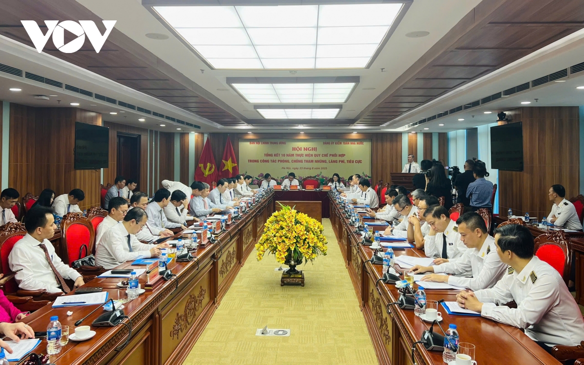 VOV.VN - Ngày 23/8, tại Hà Nội, Kiểm toán Nhà nước tổ chức hội nghị tổng kết 10 năm thực hiện quy chế phối hợp giữa Ban Nội chính Trung ương với Đảng ủy Kiểm toán nhà nước trong công tác phòng chống tham nhũng, lãng phí, tiêu cực.