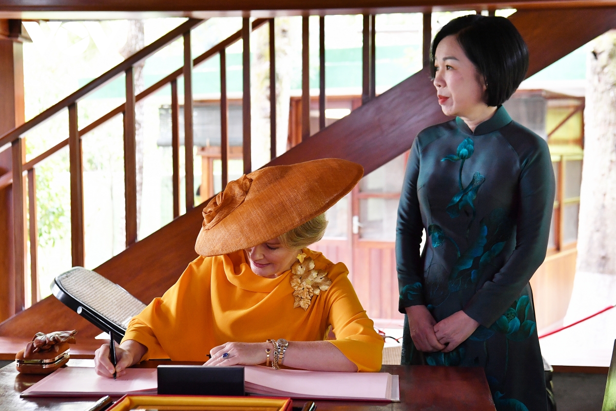 Hoàng hậu Mathilde viết lưu bút, bày tỏ ấn tượng về chuyến tham quan Khu Di tích Chủ tịch Hồ Chí Minh.