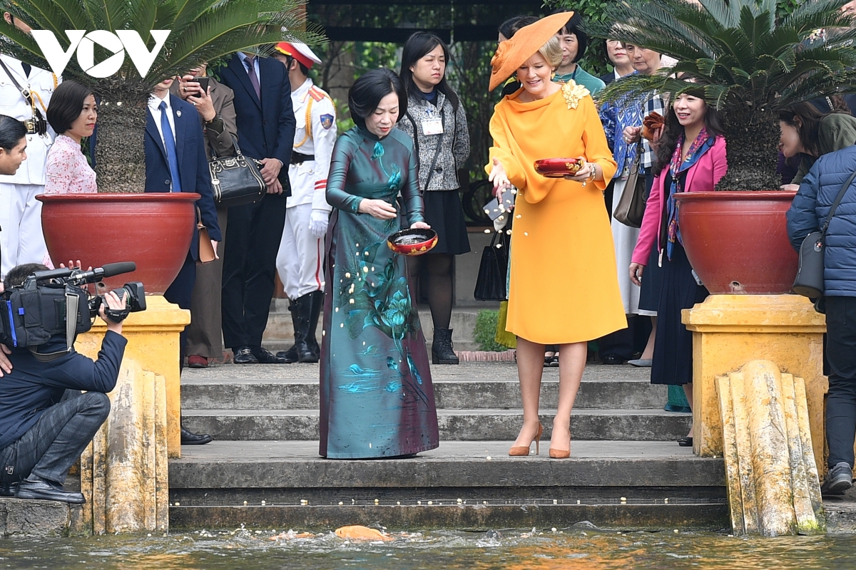 Nhà sàn Bác Hồ là ngôi nhà sàn đơn sơ, giản dị nằm bên cạnh hồ nước trong xanh, giữa một vườn cây xanh mát đã trở thành hình ảnh thân thuộc, là biểu trưng cho giá trị đạo đức, tư tưởng và phong cách sống vô cùng giản dị mà thanh cao của Chủ tịch Hồ Chí Minh. Trong ảnh: Phu nhân Nguyễn Thị Minh Nguyệt cùng Hoàng hậu Mathilde cho cá ăn tại Ao cá Bác Hồ.