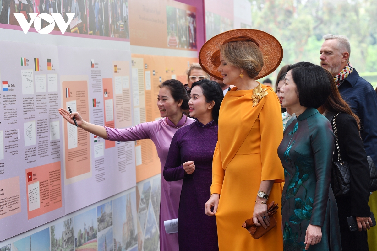 Phu nhân Nguyễn Thị Minh Nguyệt cùng Hoàng hậu Mathilde tham quan triển lãm tại Khu Di tích Chủ tịch Hồ Chí Minh.