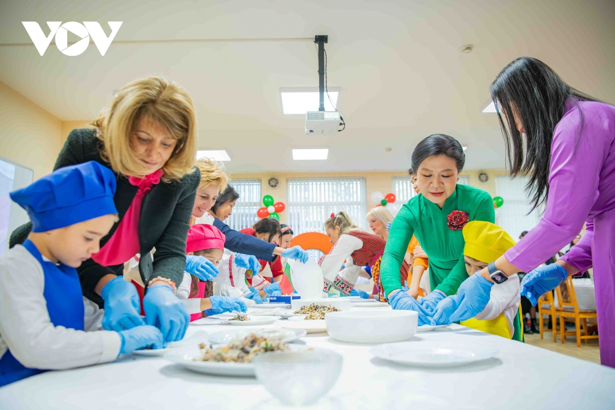 Không khí hữu nghị càng thêm đậm nét khi Phu nhân Desislava Radeva cùng các em nhỏ hào hứng tập cuốn món nem Việt Nam - biểu tượng quen thuộc của ẩm thực Việt. Những chiếc nem nhỏ xinh được hai Phu nhân, thầy cô và các em cùng thưởng thức trong tiếng cười rộn ràng, tạo nên khung cảnh ấm áp, gần gũi.