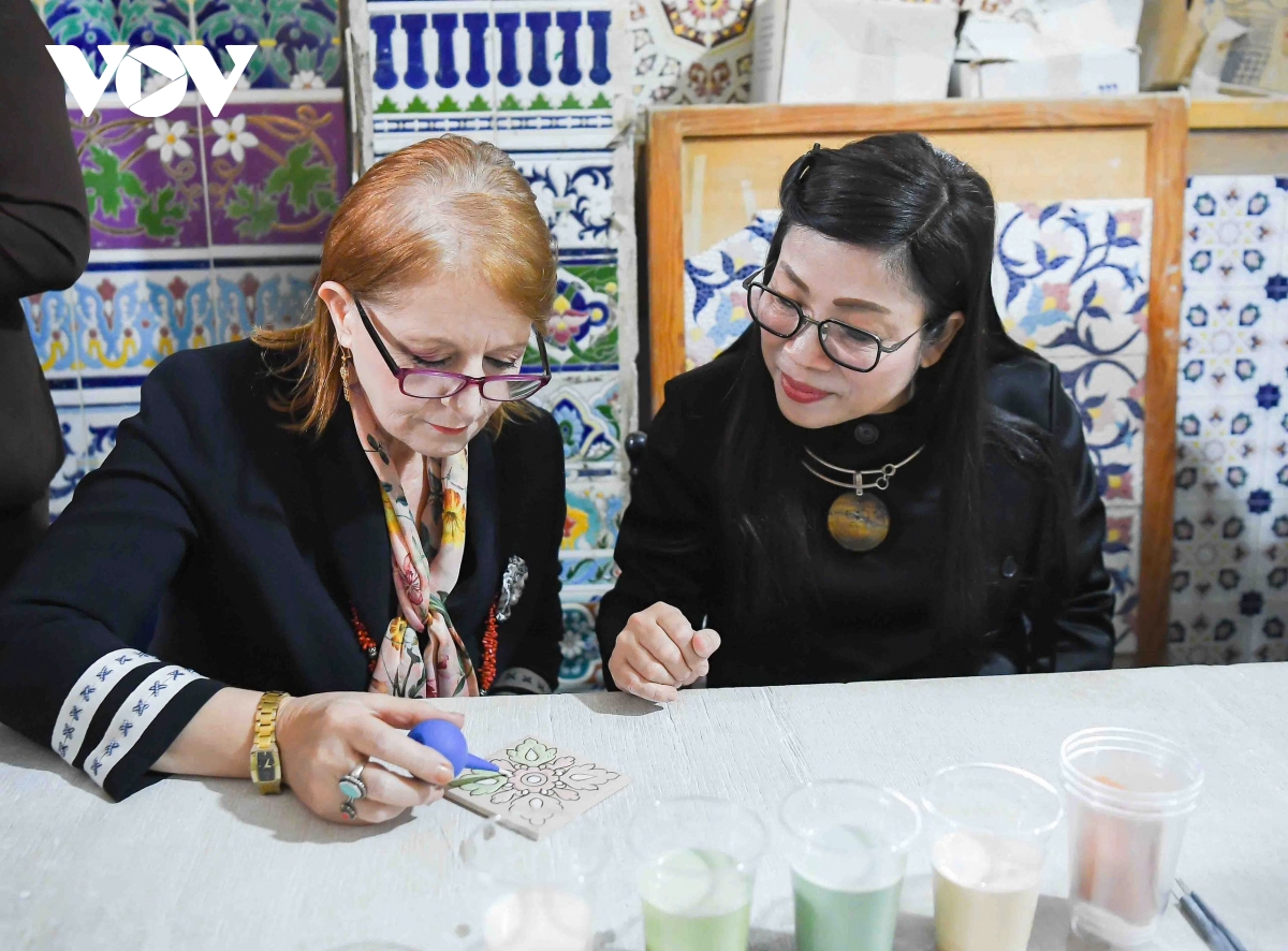 Nghề làm gốm ở Algeria có truyền thống rất lâu đời, xuất phát từ các vùng nông thôn. Đây không chỉ là nghề truyền thống mà còn là phần của di sản văn hóa, hấp dẫn du khách. Tại đây, Phu nhân Lê Thị Bích Trân cùng bà Bộ trưởng Houria Meddahi cùng trang trí một bức gốm với các hoạ tiết đậm chất Algeria.