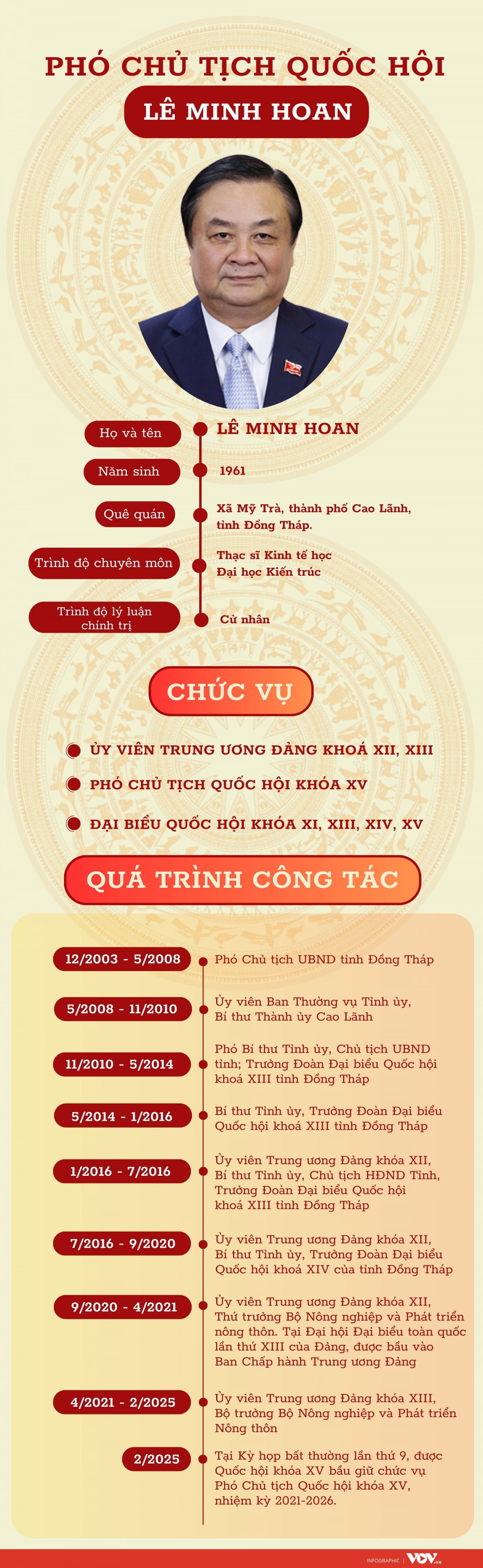 VOV.VN - Ông Lê Minh Hoan sinh năm 1961, đã trải qua các chức vụ như Bí thư Tỉnh ủy Đồng Tháp, Bộ trưởng Bộ NN &PTNT trước khi được Quốc hội bầu làm Phó Chủ tịch Quốc hội khóa XV.