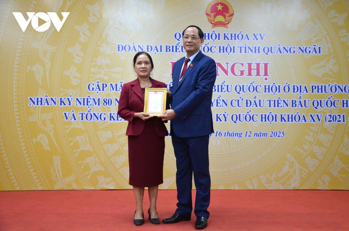 VOV.VN - Chiều 16/12, Đoàn đại biểu Quốc hội tỉnh Quảng Ngãi tổ chức Hội nghị gặp mặt các thế hệ đại biểu Quốc hội của tỉnh nhân kỷ niệm 80 năm Ngày Tổng tuyển cử đầu tiên bầu Quốc hội Việt Nam (6/1/1946 – 6/1/2026), đồng thời tổng kết hoạt động của Đoàn đại biểu Quốc hội tỉnh Quảng Ngãi khóa XV, nhiệm kỳ 2021–2026.