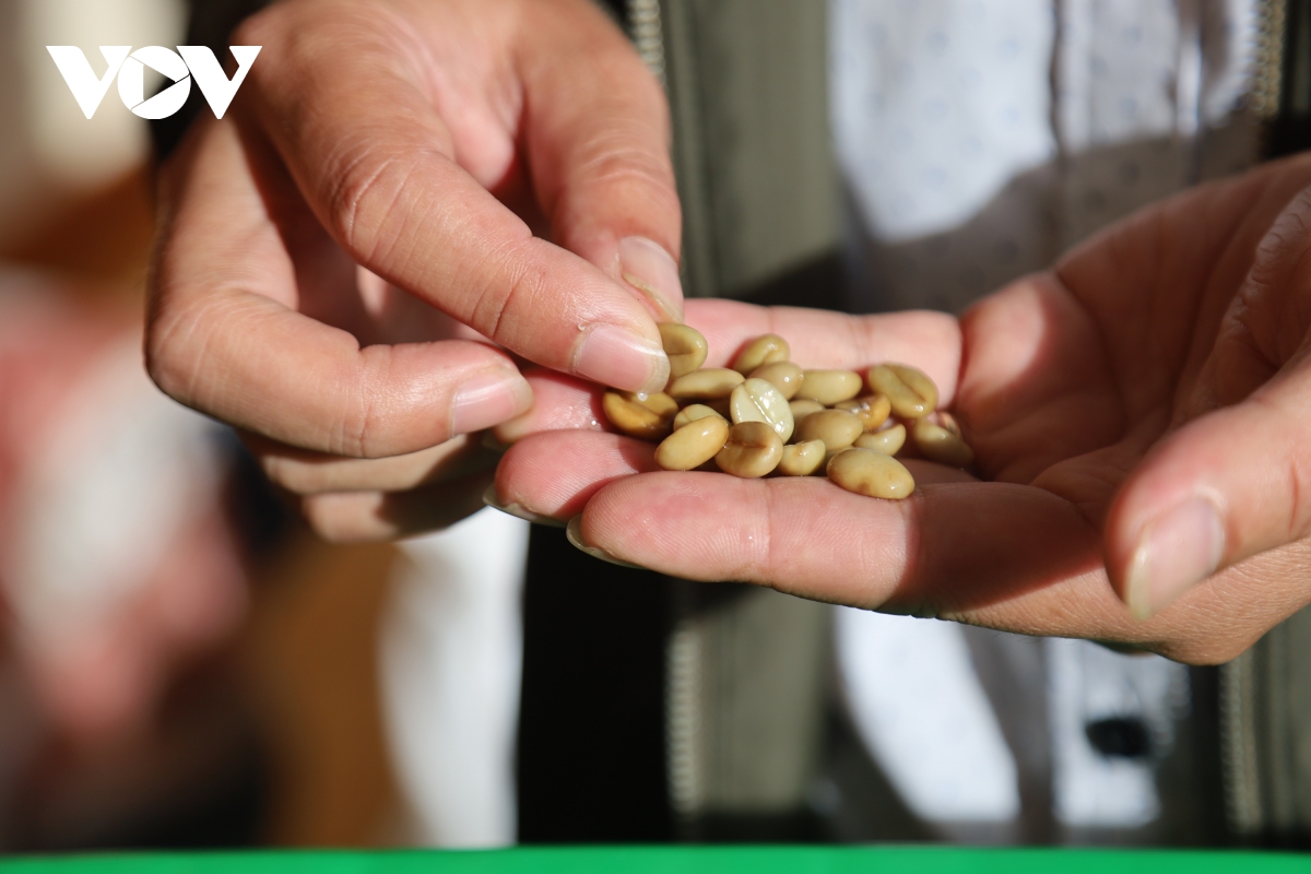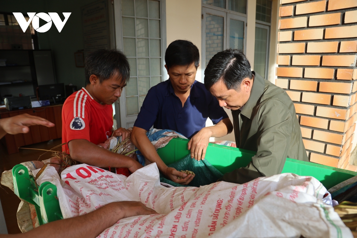 Cán bộ xã Tu Mơ Rông, tỉnh Quảng Ngãi kiểm tra việc ủ hạt cà phê để chuẩn bị ươm giống.