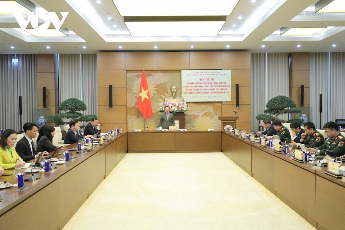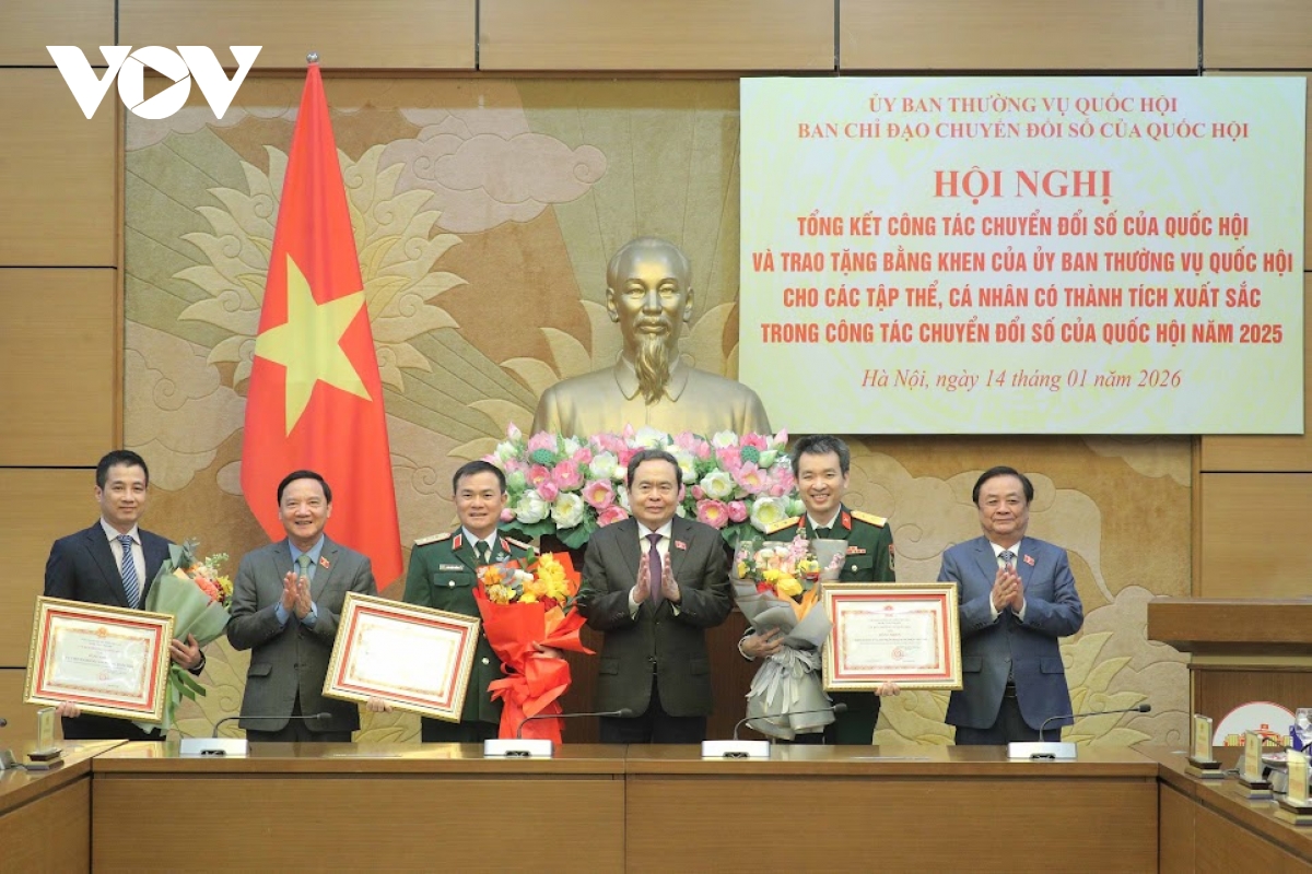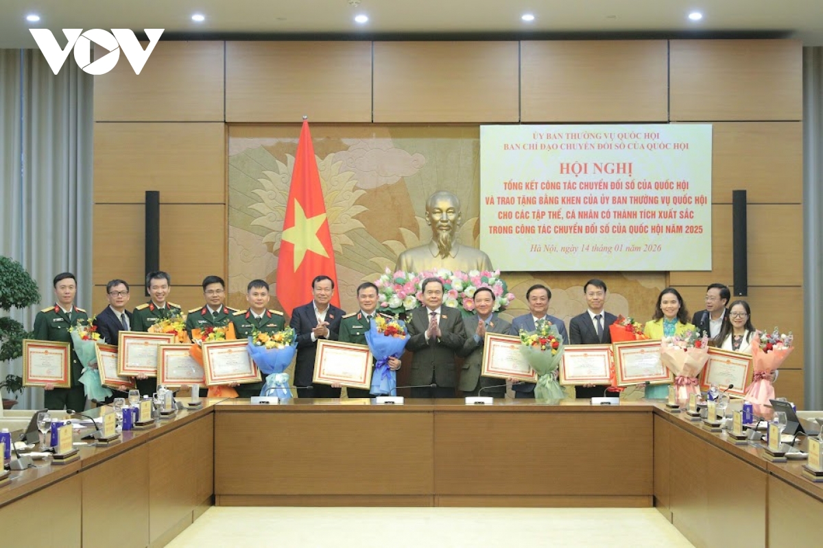 VOV.VN - Chiều 14/1, Ủy Ban Thường vụ Quốc hội, Ban chỉ đạo chuyển đổi số Quốc hội tổ chức Hội nghị Tổng kết công tác chuyển đổi số của Quốc hội năm 2025. Chủ tịch Quốc hội Trần Thanh Mẫn dự Lễ trao Bằng khen của Ủy ban Thường vụ Quốc hội cho các tập thể, cá nhân có thành tích xuất sắc trong công tác chuyển đổi số.