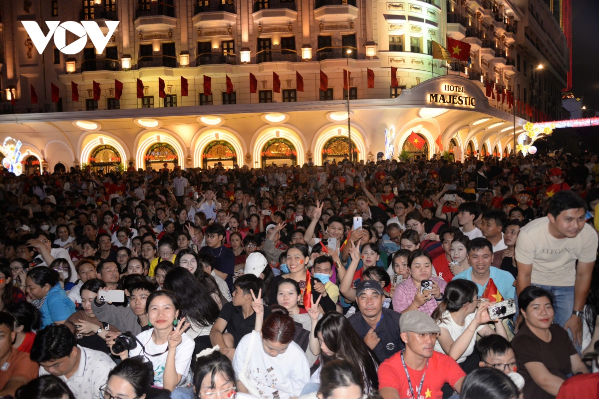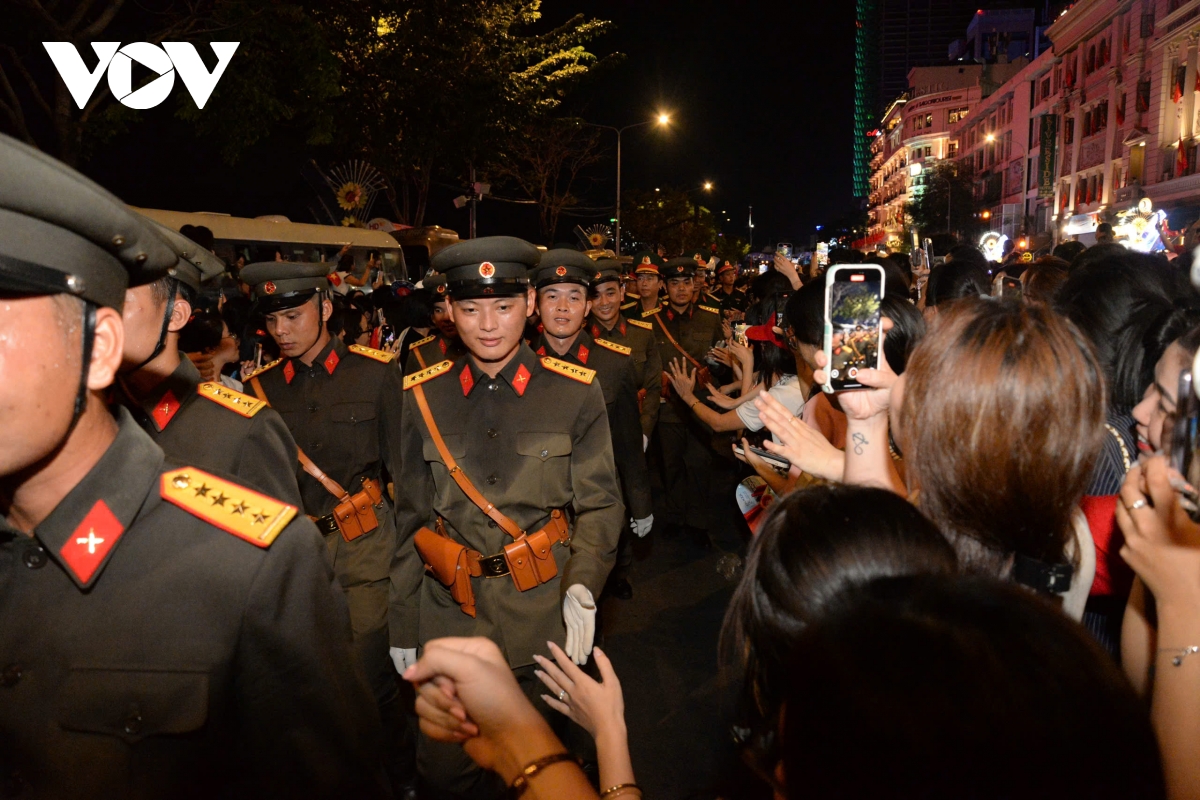 Dòng người dân vây quanh, hò reo, phấn khích khi các khối lực lượng vũ trang diễu hành đường phố, sau khi hoàn thành sơ duyệt diễu binh diễu hành qua khán đài phía trước Hội trường Thống Nhất.