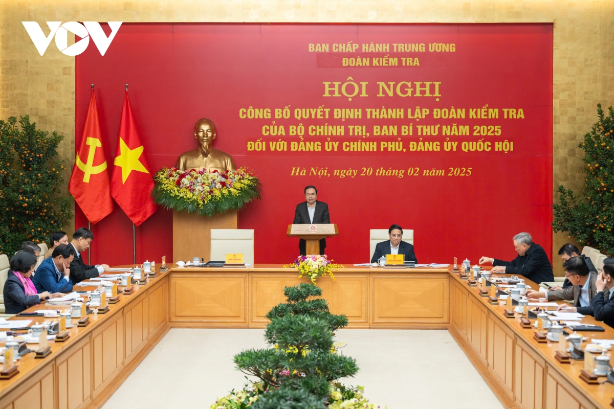 Thực hiện Kế hoạch số 26 ngày 14/2/2025 của Bộ Chính trị, Ban Bí thư về việc nắm tình hình, đôn đốc, hướng dẫn, kiểm tra một số chuyên đề công tác trong tâm năm 2025, hôm nay, 20/2, tại Văn phòng Chính phủ diễn ra Hội nghị công bố quyết định thành lập Đoàn kiểm tra của Bộ Chính trị, Ban bí thư năm 2025 đối với Đảng ủy Chính phủ, Đảng ủy Quốc hội. Bí thư Đảng ủy Chính phủ, Thủ tướng Chính phủ Phạm Minh Chính và Bí thư Đảng ủy Quốc hội, Chủ tịch Quốc hội Trần Thanh Mẫn đồng chủ trì hội nghị.