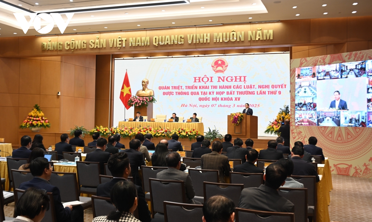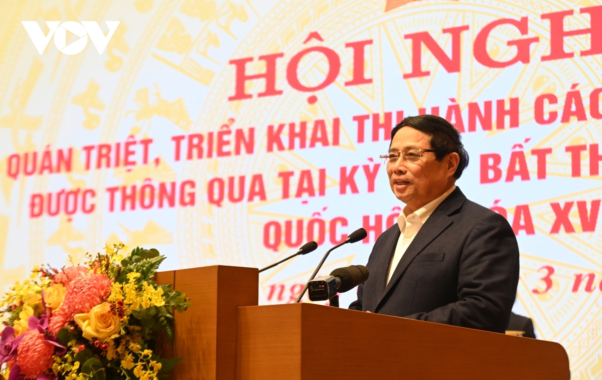 VOV.VN - Ngày 7/3, tại trụ sở Chính phủ, Hội nghị quán triệt, triển khai thi hành các luật, Nghị quyết được thông qua tại kỳ họp bất thường lần thứ 9, Quốc hội khóa XV đã diễn ra dưới sự chủ trì của Thủ tướng Phạm Minh Chính.